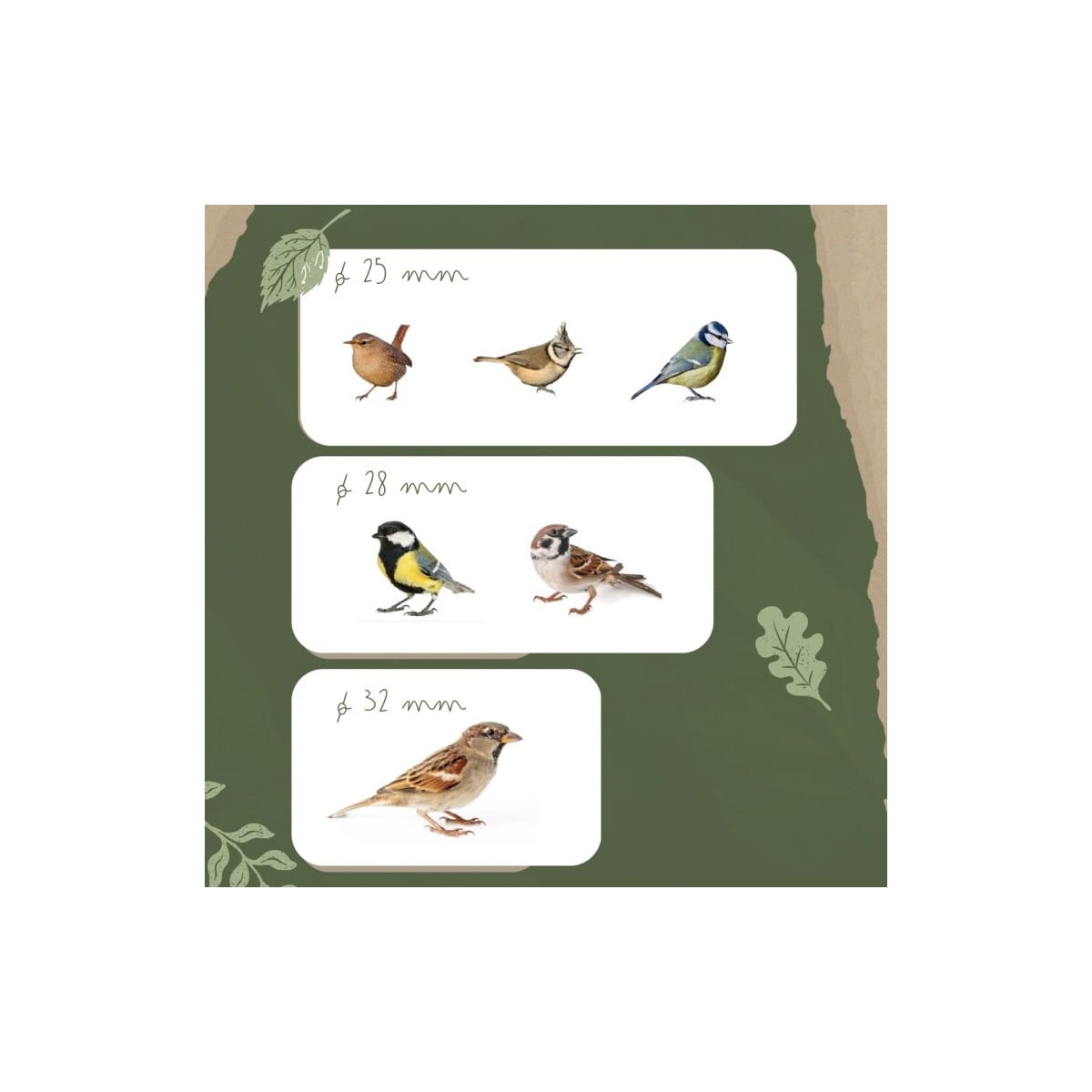 - Ø 25 mm para Cochin Comun, Herrerillo Comun y Herrerillo Capuchino.