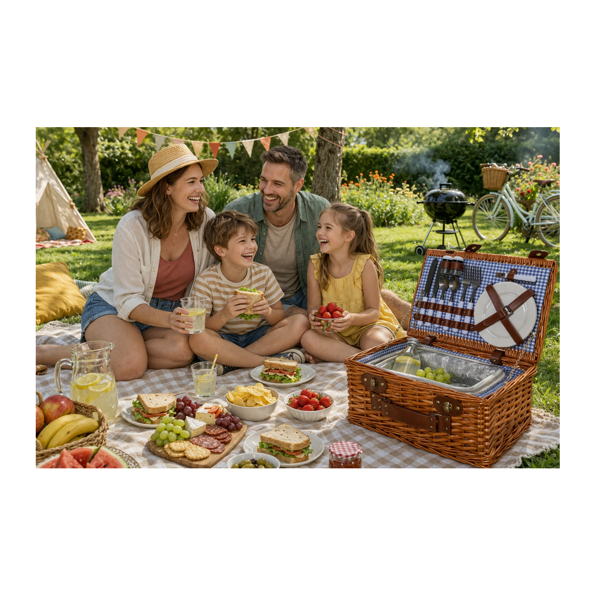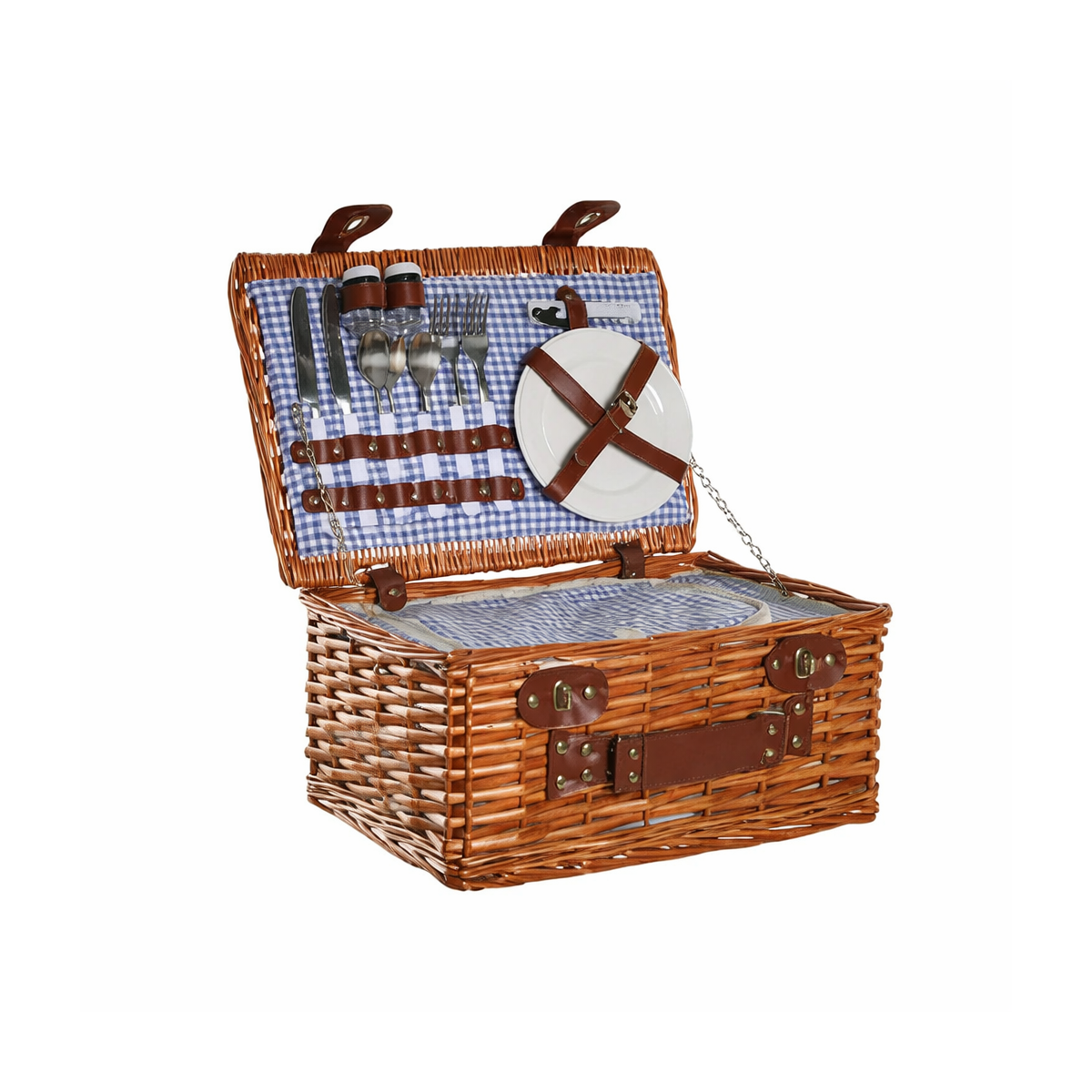 - Tipo: Cesta de picnic de mimbre con interior equipado y compartimento térmico para alimentos y bebidas.
