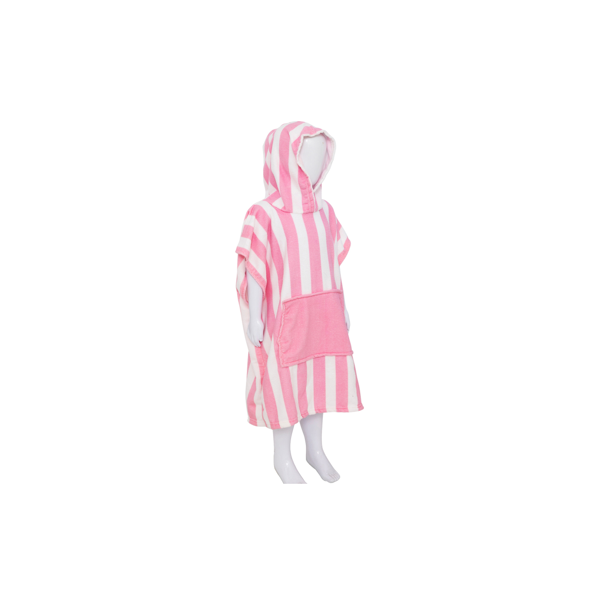 - Diseño: Poncho de rayas rosa con bolsillo frontal y capucha.