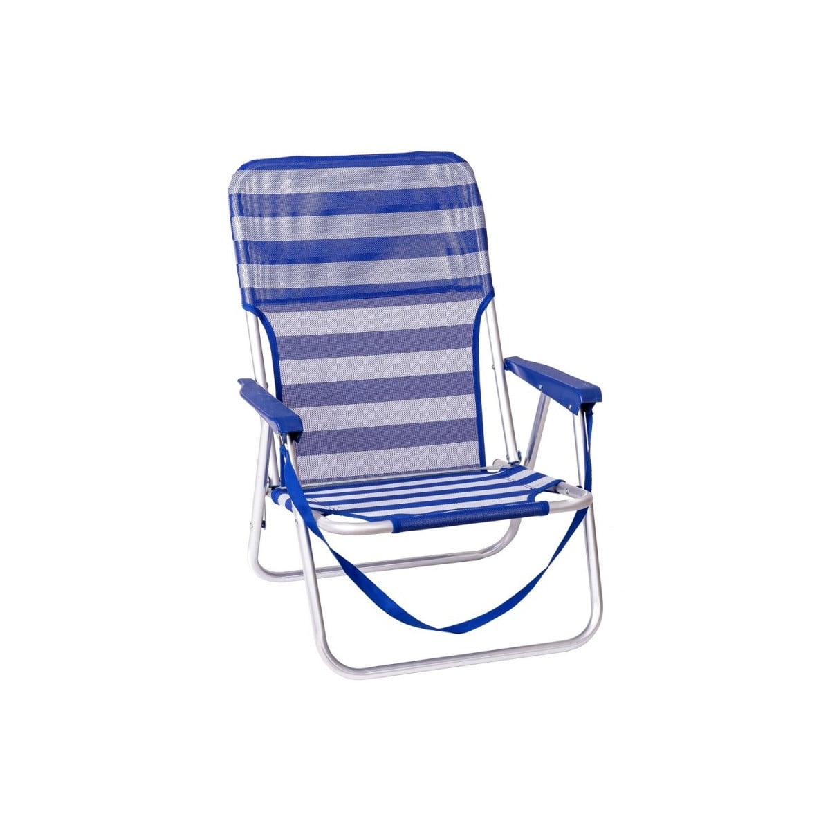 Está fabricada con estructura de aluminio, lo que la hace ligera y resistente al mismo tiempo, y cuenta con asiento de textileno, un material transpirable que aporta frescura y comodidad incluso en los días más calurosos. Su diseño en color azul a rayas le da un toque veraniego perfecto para cualquier plan exterior.
