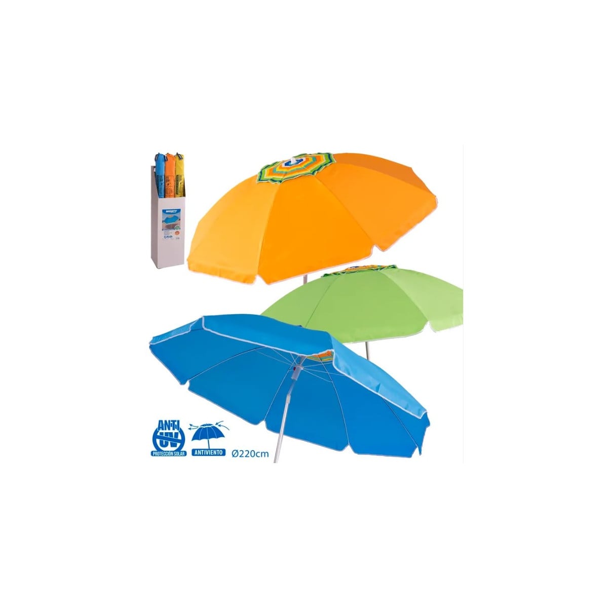 Esta sombrilla de 220 cm de diámetro cuenta con todas las características esenciales para pasar un día estupendo en la playa. El sistema antiviento proporciona una gran estabilidad incluso en condiciones ventosas. Además, el mástil de aluminio le confiere resistencia sin sacrificar ligereza, mientras que el tejido, elaborado con poliéster de 140 GSM y con tratamiento anti-UV, garantiza durabilidad y protección. Lo mejor de todo es que es inclinable, así que no tendrás que andar clavándola una y mil veces para seguir el rastro del sol.