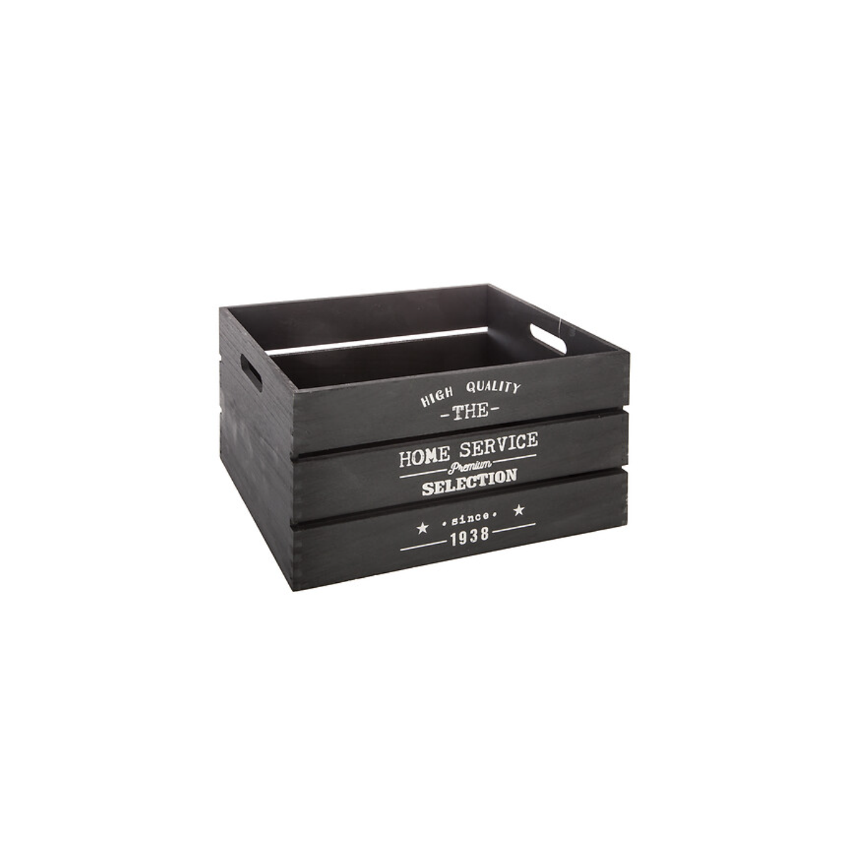 Caja decorativa Ylias tamaño pequeño, en madera negra con estilo caja de frutas vintage. Perfecta para guardar pequeños objetos y mantener ordenado cualquier rincón.