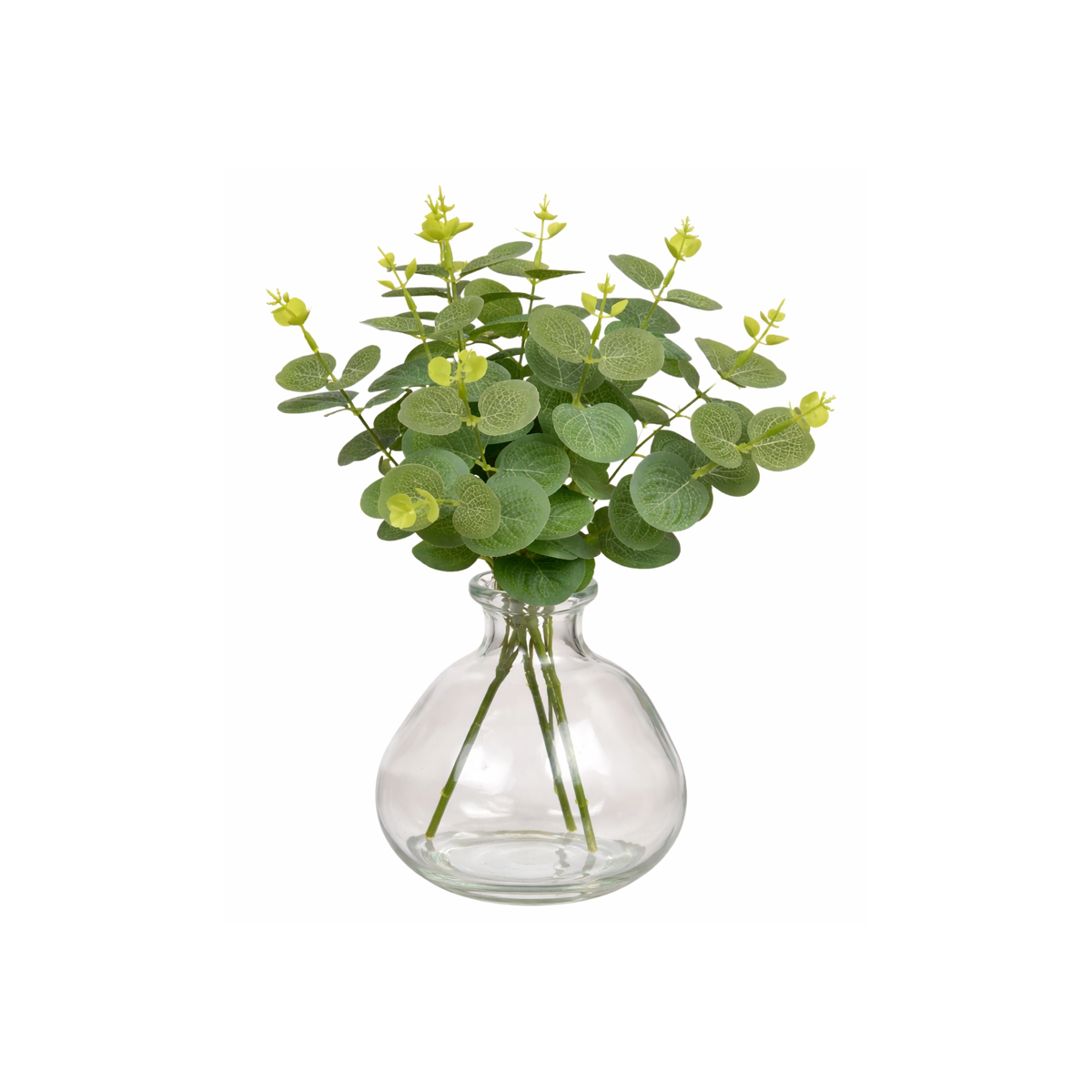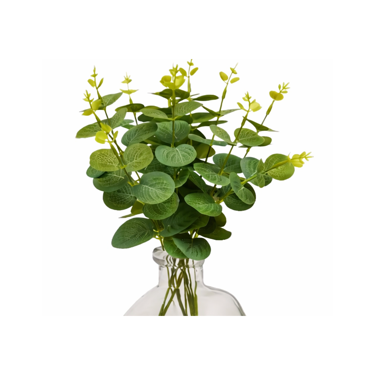 - Material: Jarrón de vidrio con ramas de eucalipto artificial fabricadas en material sintético.