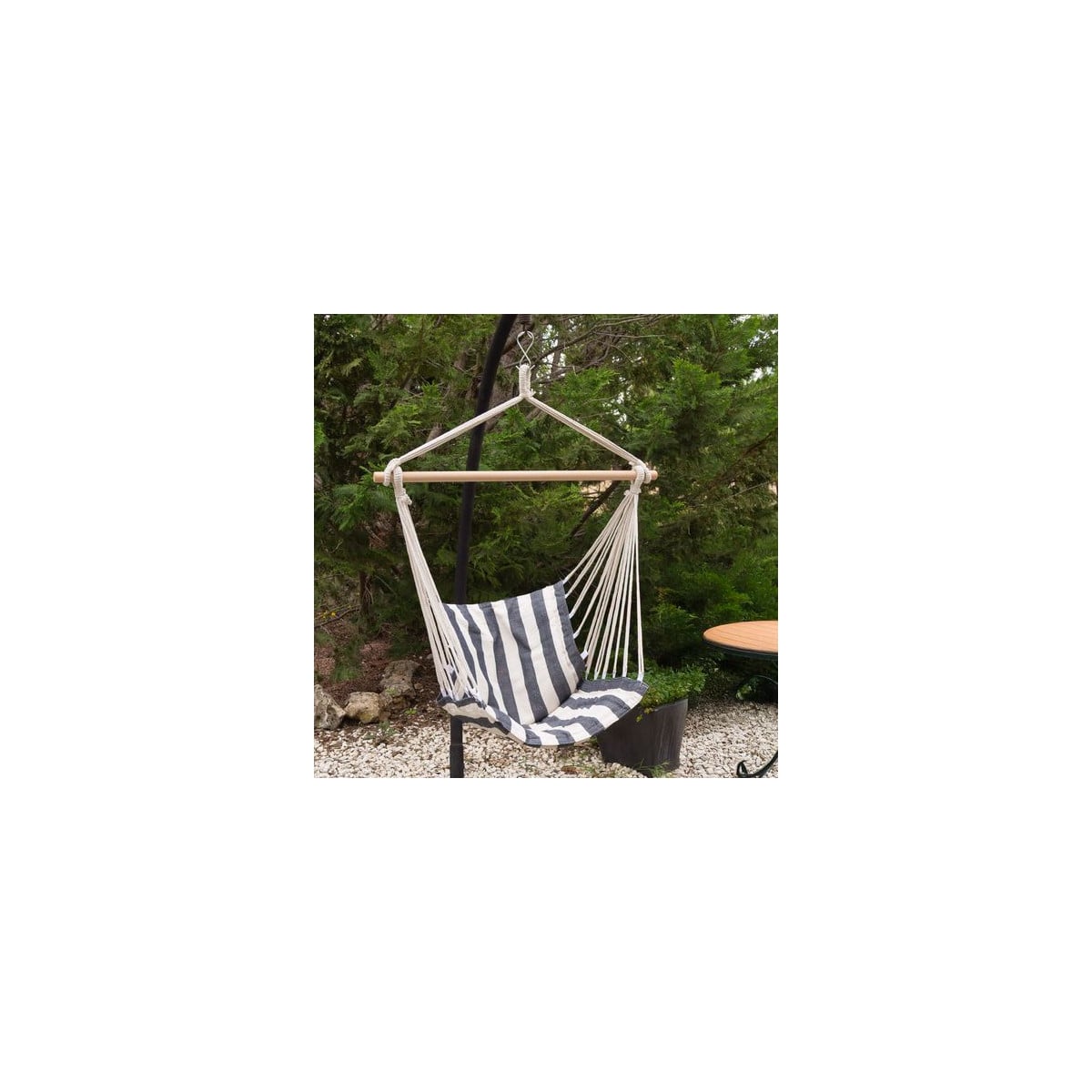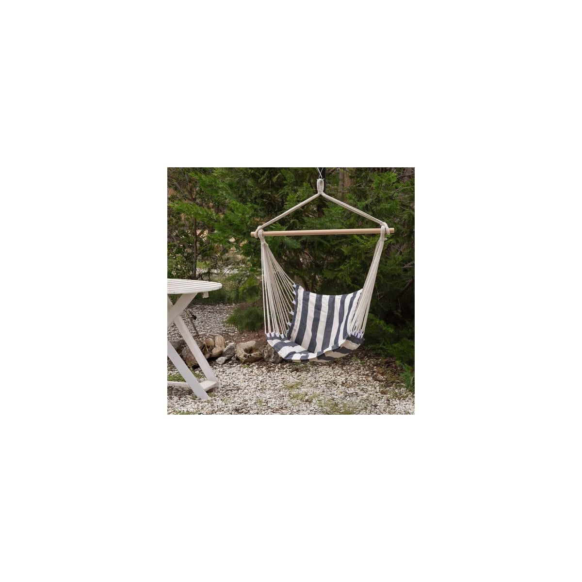 La hamaca silla colgante Aktive es perfecta para disfrutar de momentos de relax en el jardín, la terraza o incluso en tus escapadas de camping. Su diseño en tonos neutros con estampado a rayas aporta un estilo cómodo y acogedor, ideal para crear un rincón de descanso en cualquier espacio.