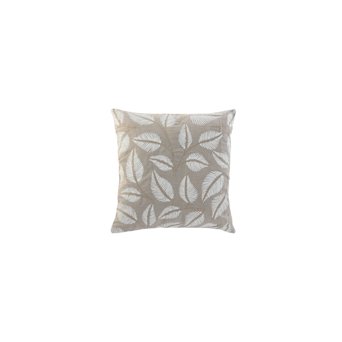 Cojín decorativo de 45x45 cm en algodón y poliéster con hojas blancas y detalles dorados. Aporta estilo natural y elegancia a sofás, camas o sillones.