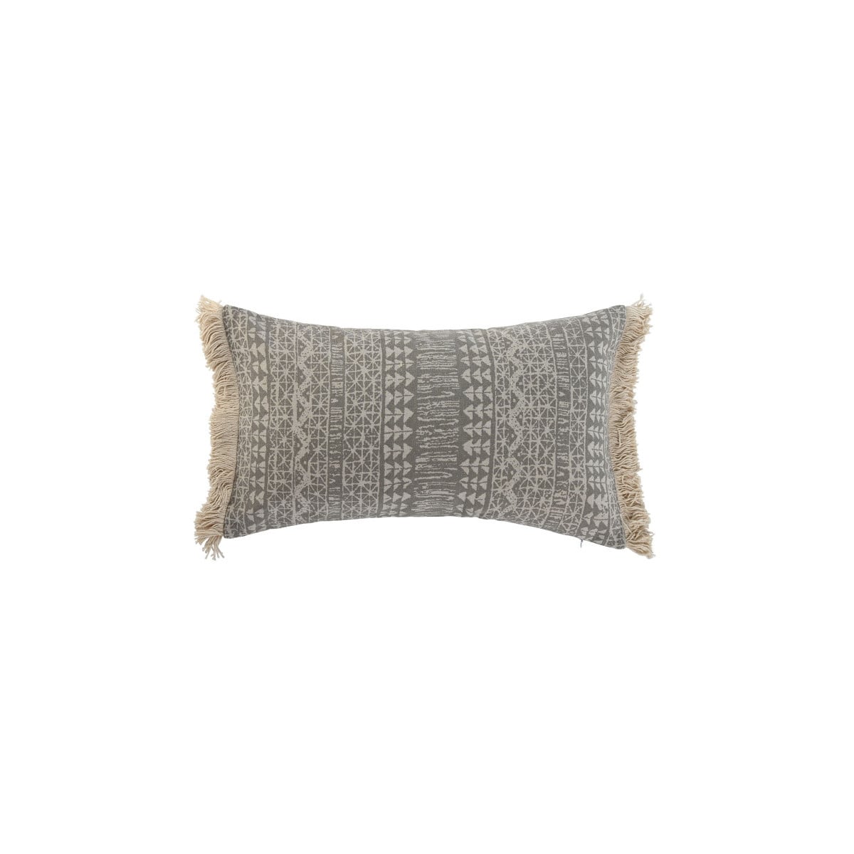 Cojín decorativo 50x30 cm en poliéster y lino con diseño tribal y flecos. Elegante, cómodo y con estilo natural. Perfecto para sofás, camas o sillones.