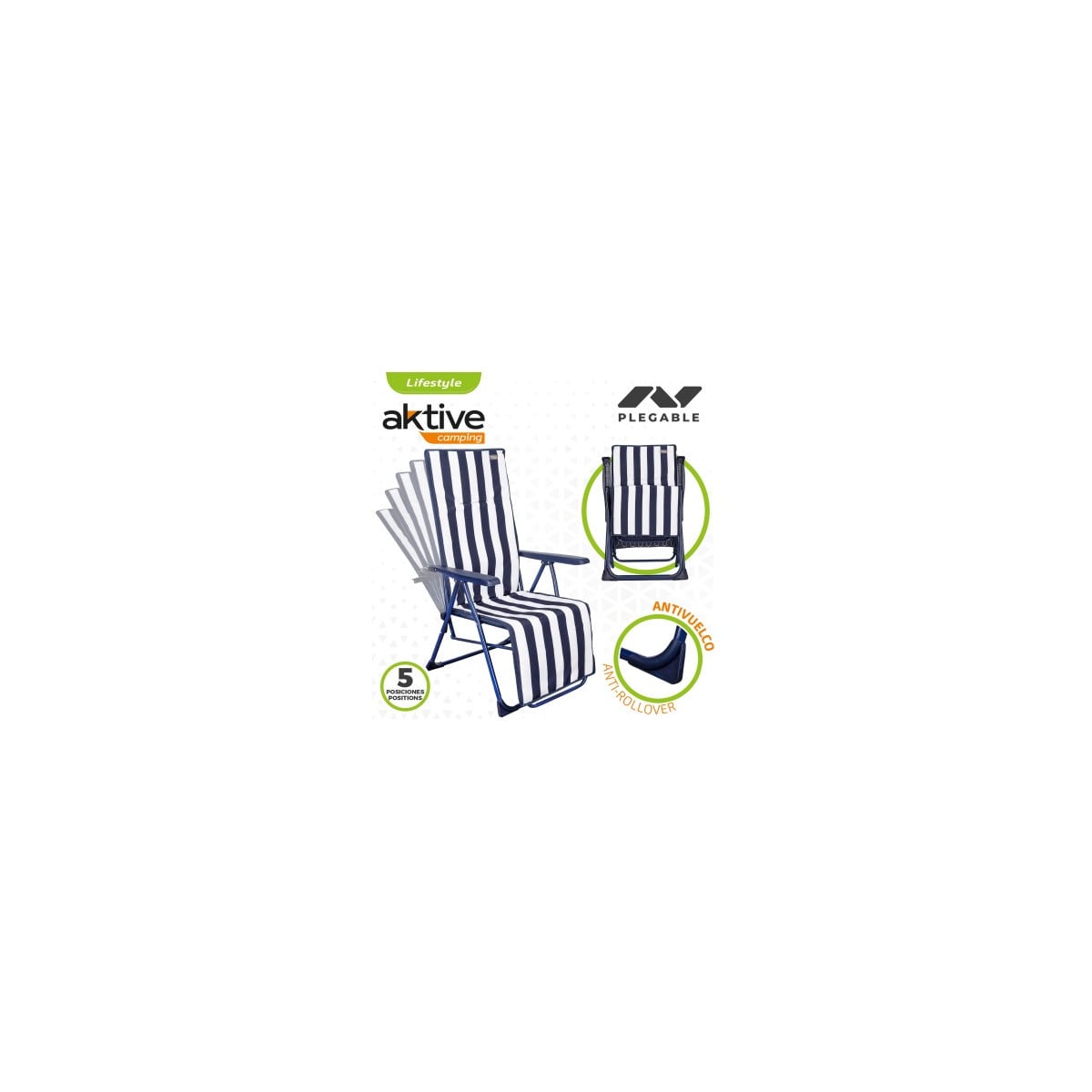 Tumbona plegable multiposición con 5 posiciones y diseño de rayas azul y blanco. Ideal para jardín o playa, cómoda, resistente y fácil de transportar.
