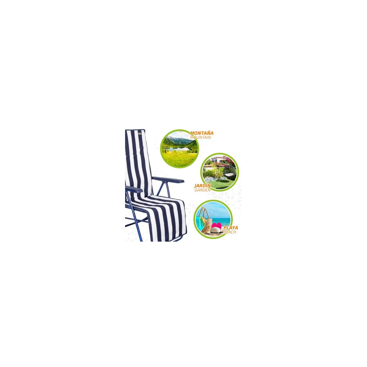 La Tumbona Reclinable Rayas Azul y Blanca Aktive Garden es la opción perfecta para disfrutar del buen tiempo con la máxima comodidad. Diseñada para adaptarse a cada momento, combina funcionalidad y confort en un formato práctico que puedes usar tanto como silla como tumbona.