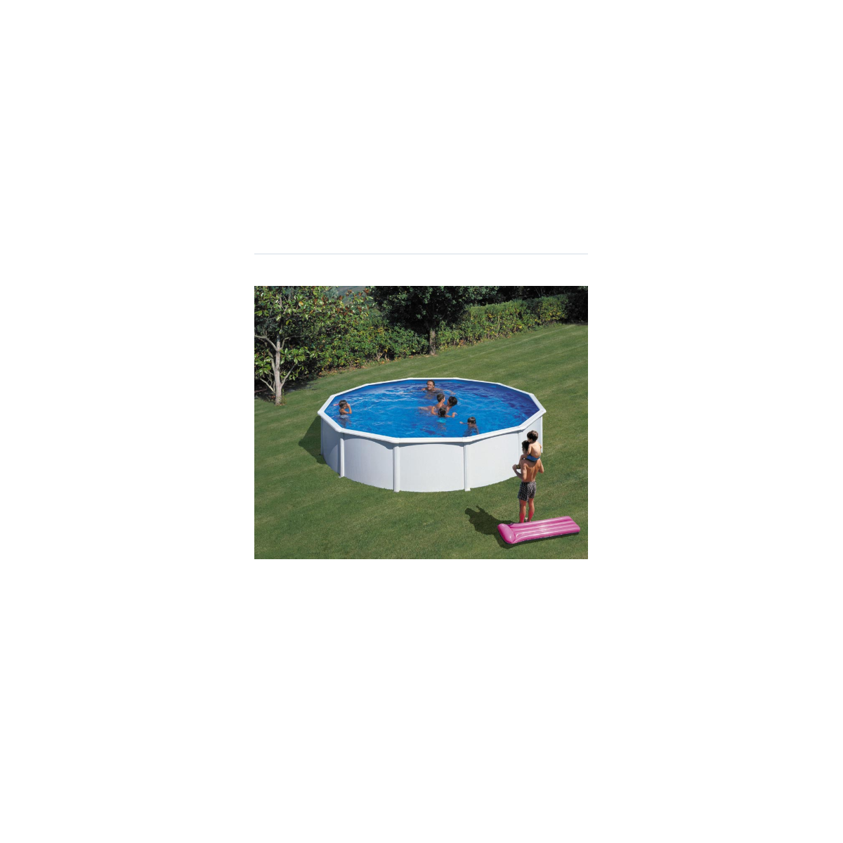 Está fabricada con una estructura de acero galvanizado lacado en blanco, pensada para ofrecer estabilidad y larga vida útil. En su interior incorpora un liner azul de PVC de 30/100 con tratamiento anti-UV, que protege frente a los efectos del sol y el uso continuo.