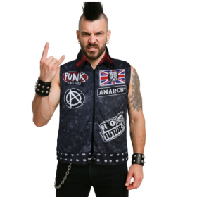 Este chaleco punki para mujer y hombre es ideal para quienes buscan un disfraz con carácter y estética rebelde. Su diseño sin mangas, con efecto desgastado y parches de inspiración punk y anarquista, aporta una imagen potente que encaja a la perfección en fiestas temáticas, carnaval o eventos de estilo rock.