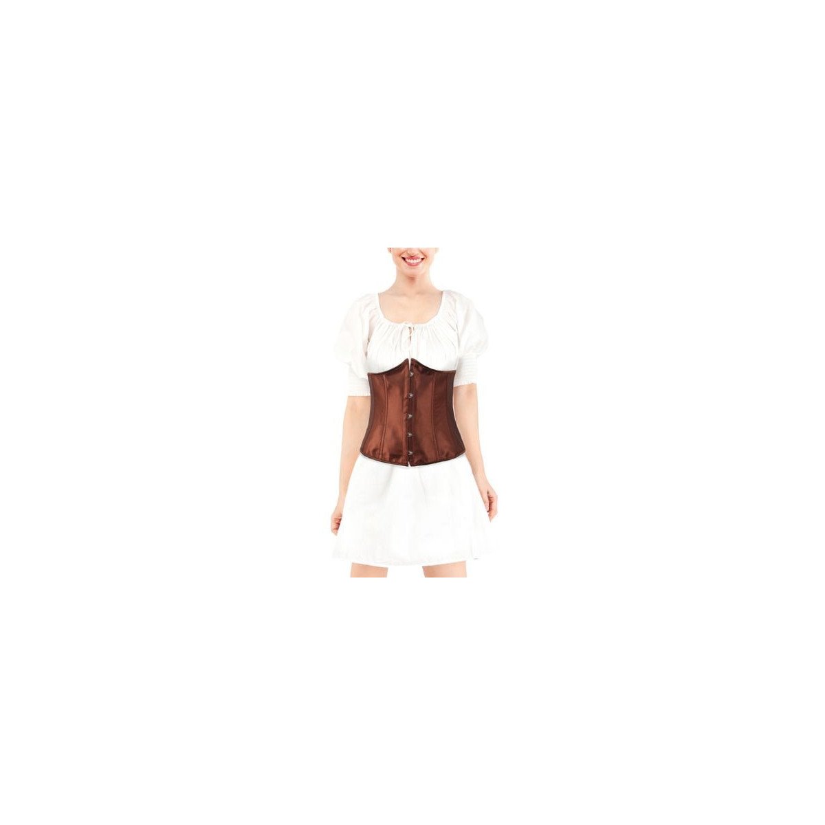 Corsé color café con acabado satinado, cierre delantero de ganchos y varillas para soporte. Ideal para looks steampunk, piratas o medievales.