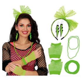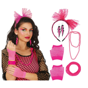 El conjunto reúne los accesorios imprescindibles para recrear la estética típica de los años 80, aportando un estilo llamativo y desenfadado. Es una opción ideal tanto para completar un disfraz temático como para transformar un outfit básico en un look retro lleno de personalidad.