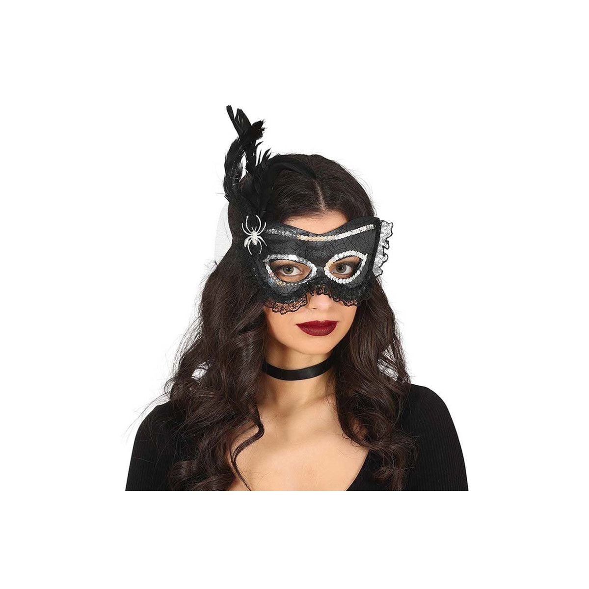 Antifaz negro con araña y pluma, elegante y misterioso, ideal para Halloween y fiestas temáticas. Ligero y cómodo para llevar durante toda la noche.