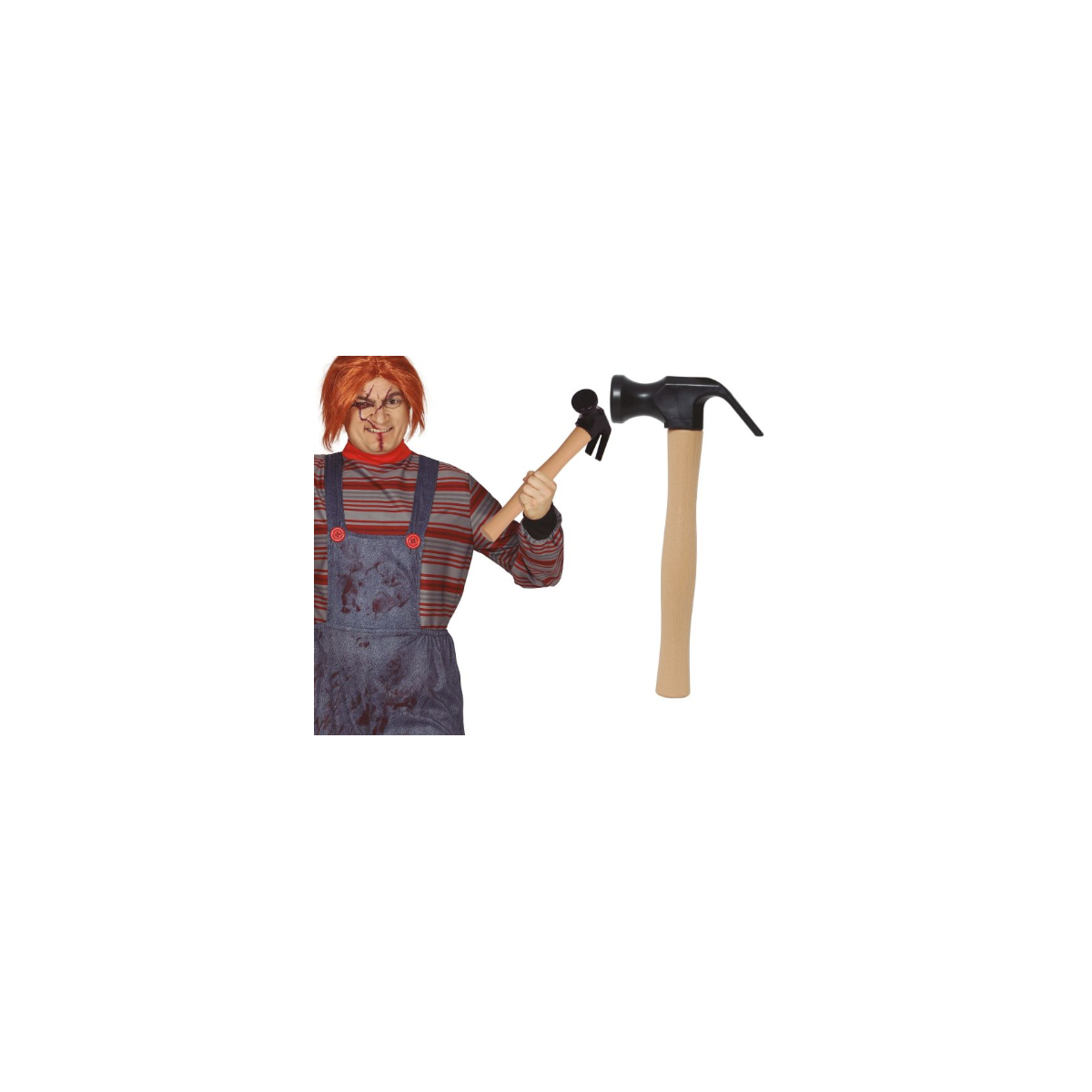 Este martillo de 40 cm es el complemento perfecto para dar un toque impactante y reconocible a disfraces de terror, personajes siniestros o looks de trabajador con un punto oscuro y divertido. Es ideal para completar disfraces de muñeco diabólico, asesino de película, obrero, carpintero o personajes de Halloween que buscan causar impresión.