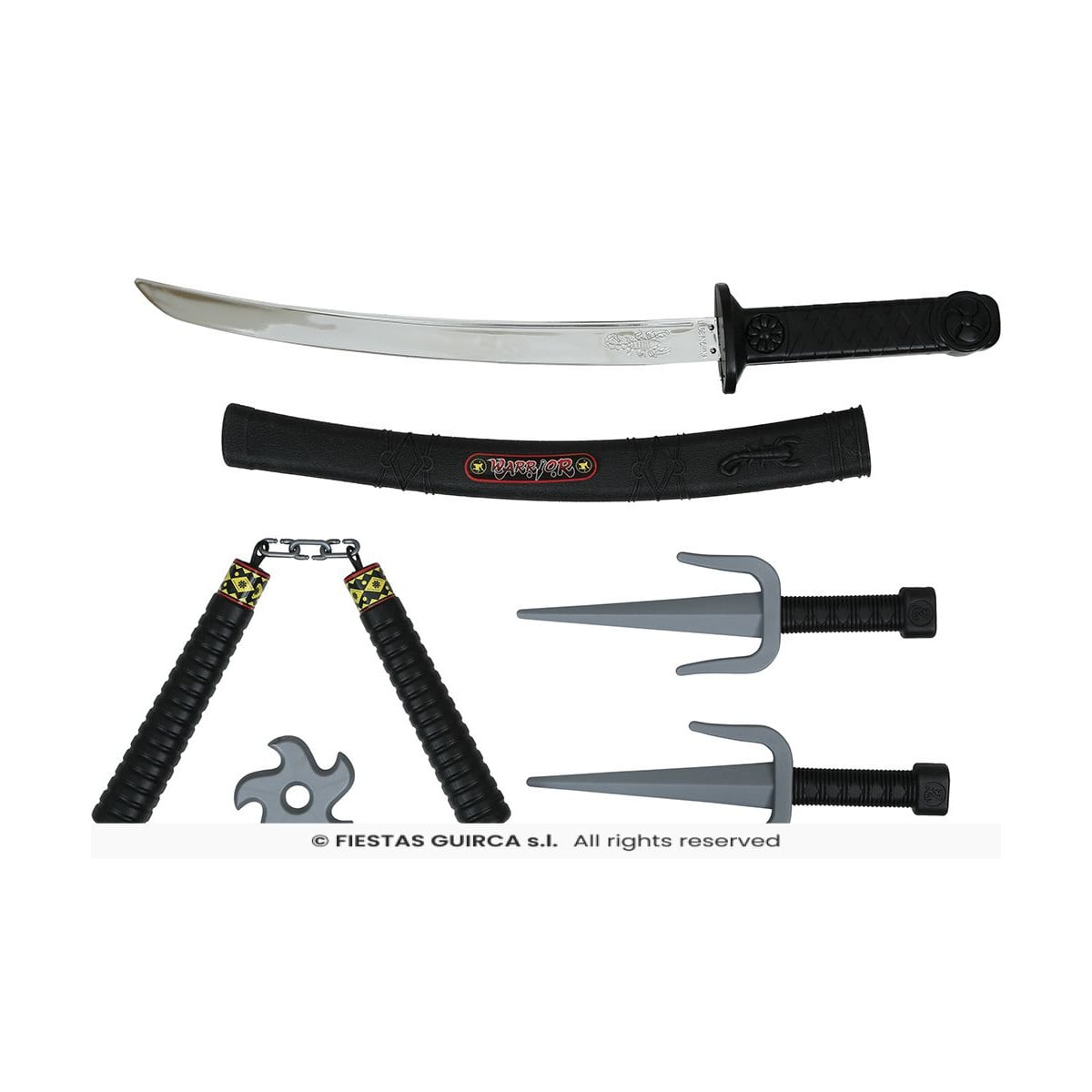 Set ninja de 5 piezas con espada, nunchakus, estrella y dagas perfecto para completar disfraces en carnaval o fiestas temáticas. Un complemento ideal para pequeños guerreros.
