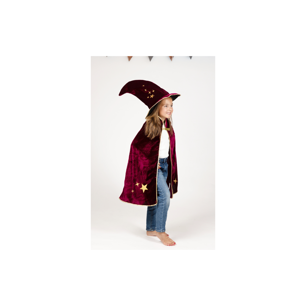 - Incluye: Capa de terciopelo burdeos, ribete dorado y estampado de estrellas.