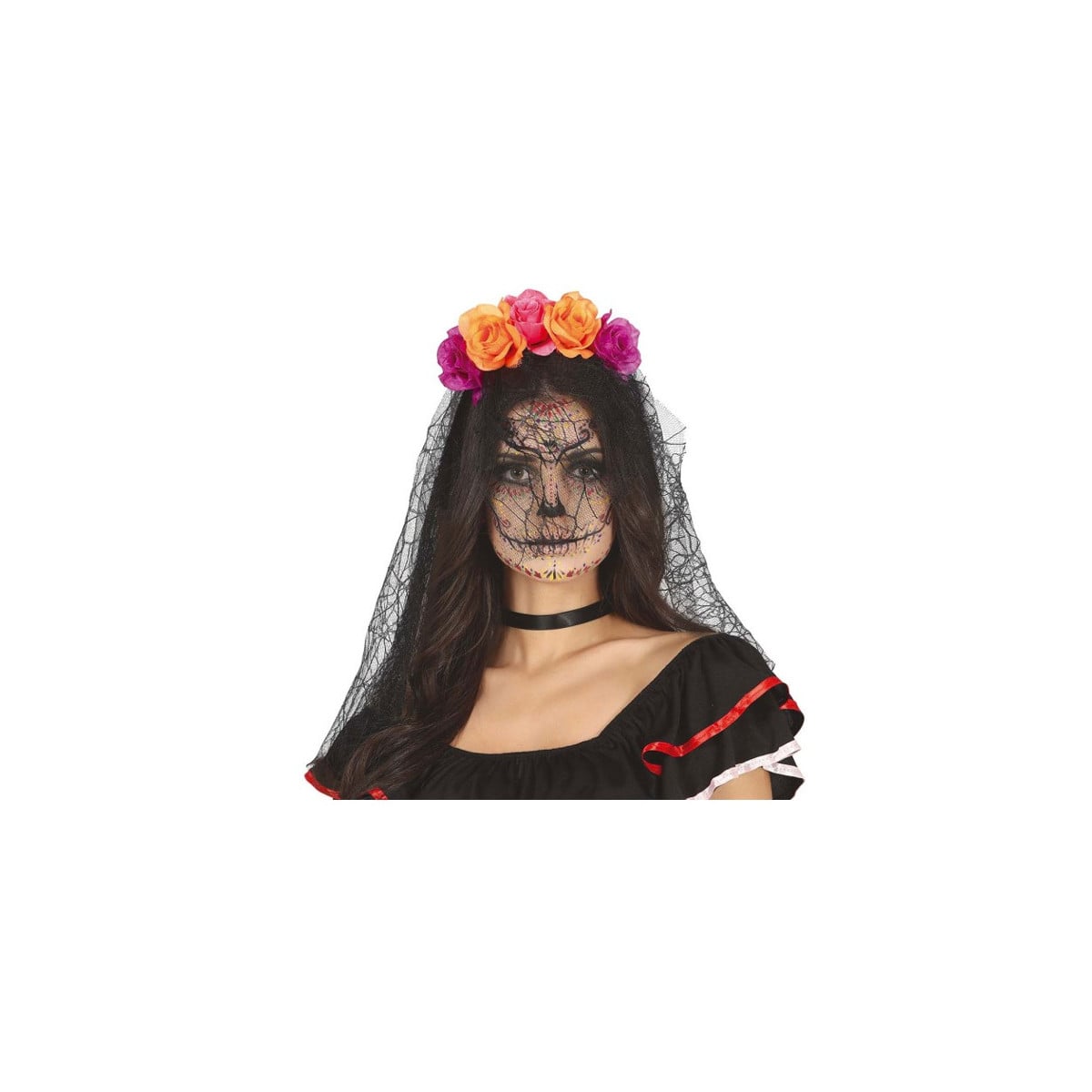 Complementa tu disfraz con la Diadema de Flores Lilas y Naranjas Con Velo.