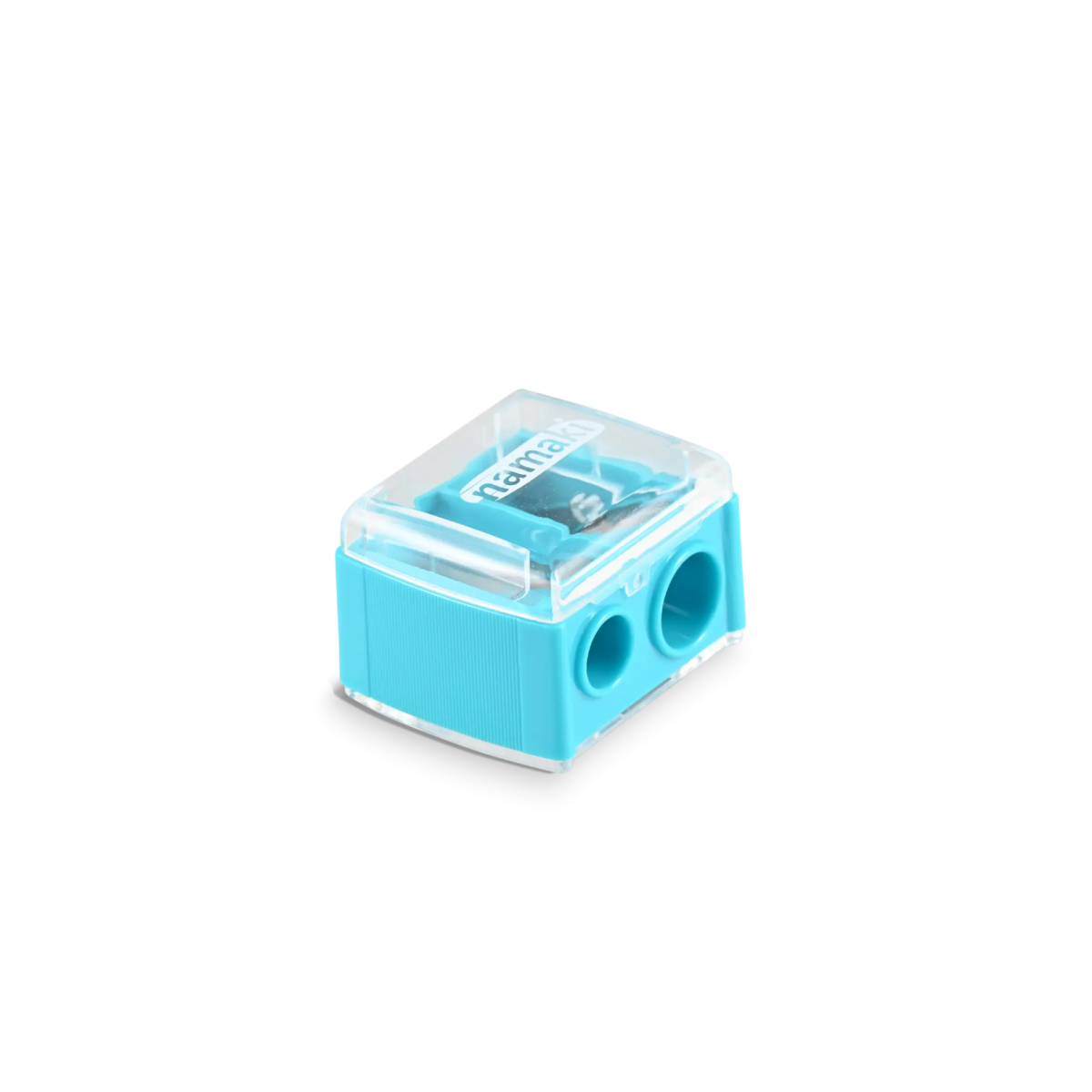 Sacapuntas doble Namaki con depósito y varilla de limpieza. Ideal para lápices de maquillaje infantiles. Práctico, compacto y muy fácil de usar.