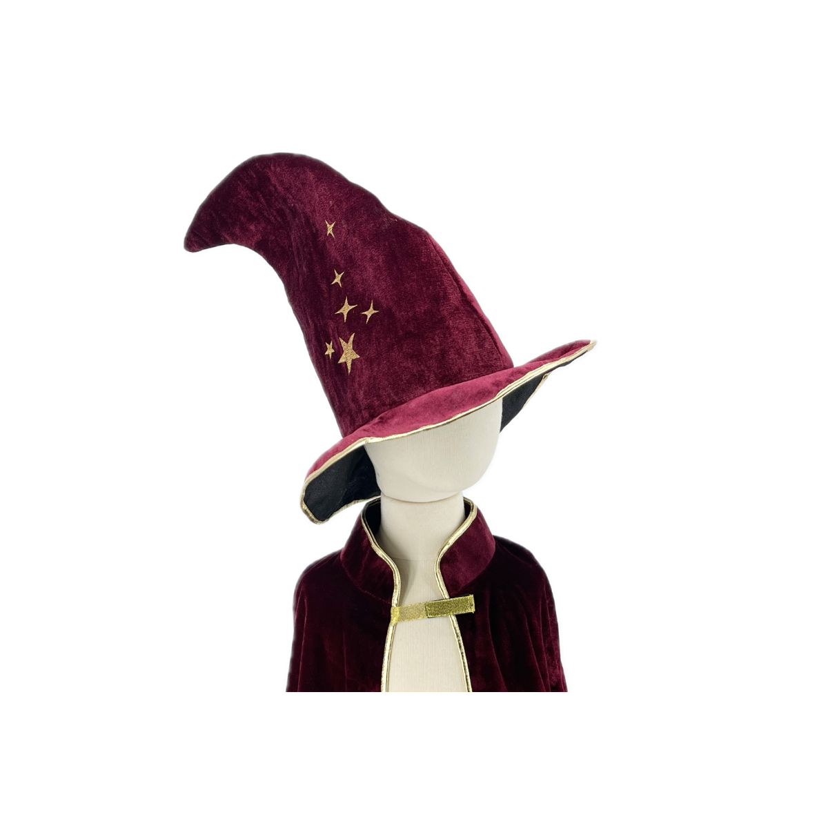 - Incluye: Gorro de terciopelo burdeos con ribete dorado y estampado de estrellas.