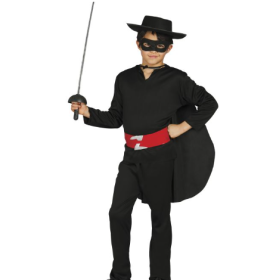 Descubre el Disfraz Bandido Con Capa Talla 7-9 Años; con antifaz y sombrero para un look misterioso y divertido, perfecto para carnaval, teatro y fiestas escolares.