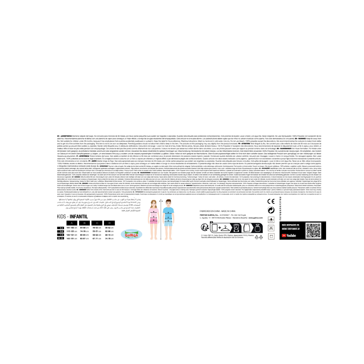 - Talla: Talla 7-9 años; altura (129-137 cm), pecho (80-84 cm), cintura (58-62cm) y cadera (68-72 cm).