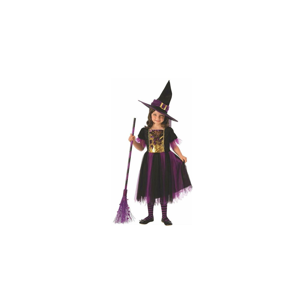 Este disfraz de brujita talla 5-7 está compuesto por un bonito vestido en tonos negros, morados y dorados, y un sombrero.