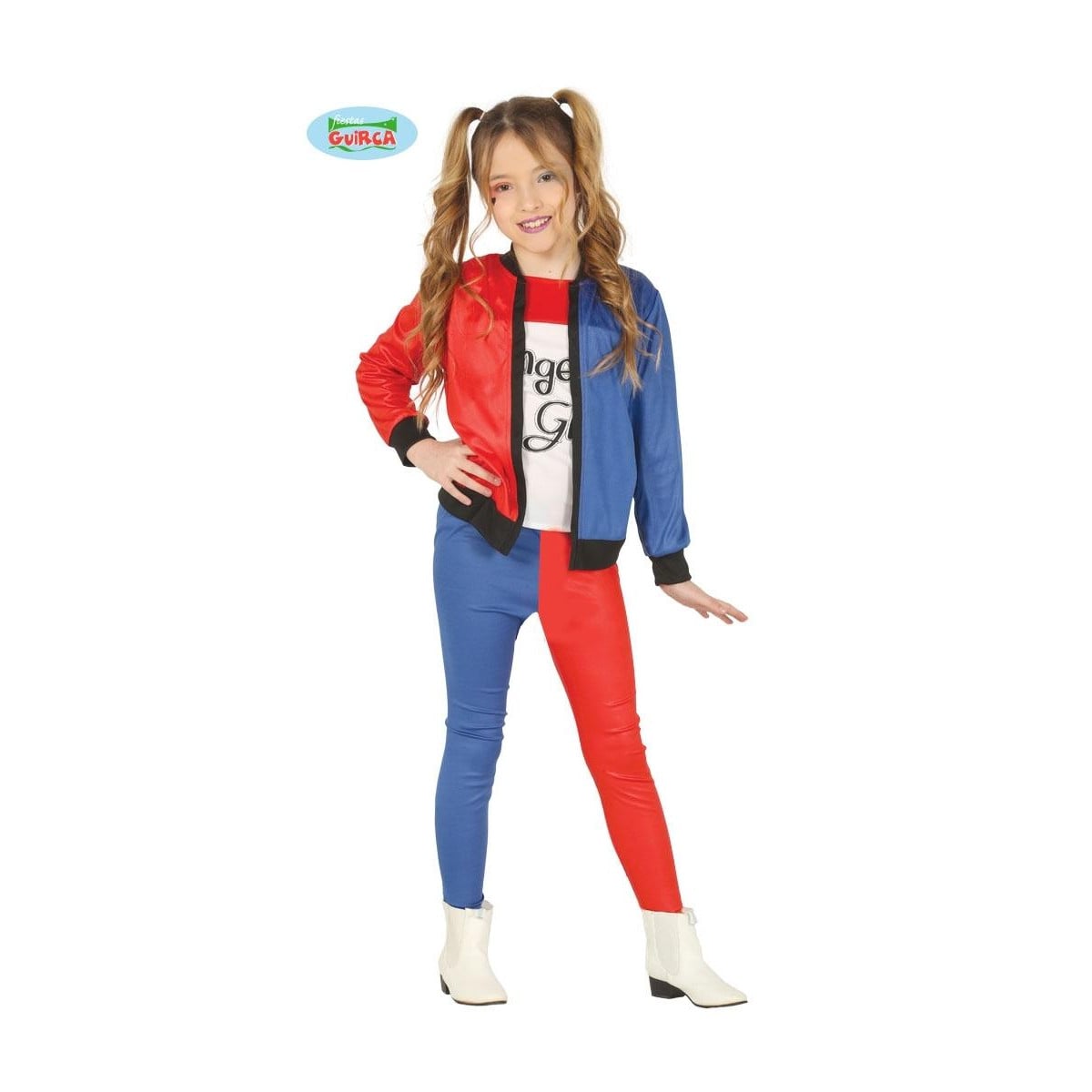 El diseño de este disfraz está inspirado en el icónico estilo de Harley Quinn, combinando colores vivos como el rojo y azul, con detalles que resaltan su personalidad traviesa y encantadora. Incluye una camiseta con estampado llamativo, unos pantalones largos a juego y una chaqueta que complementa el conjunto con un toque desenfadado.