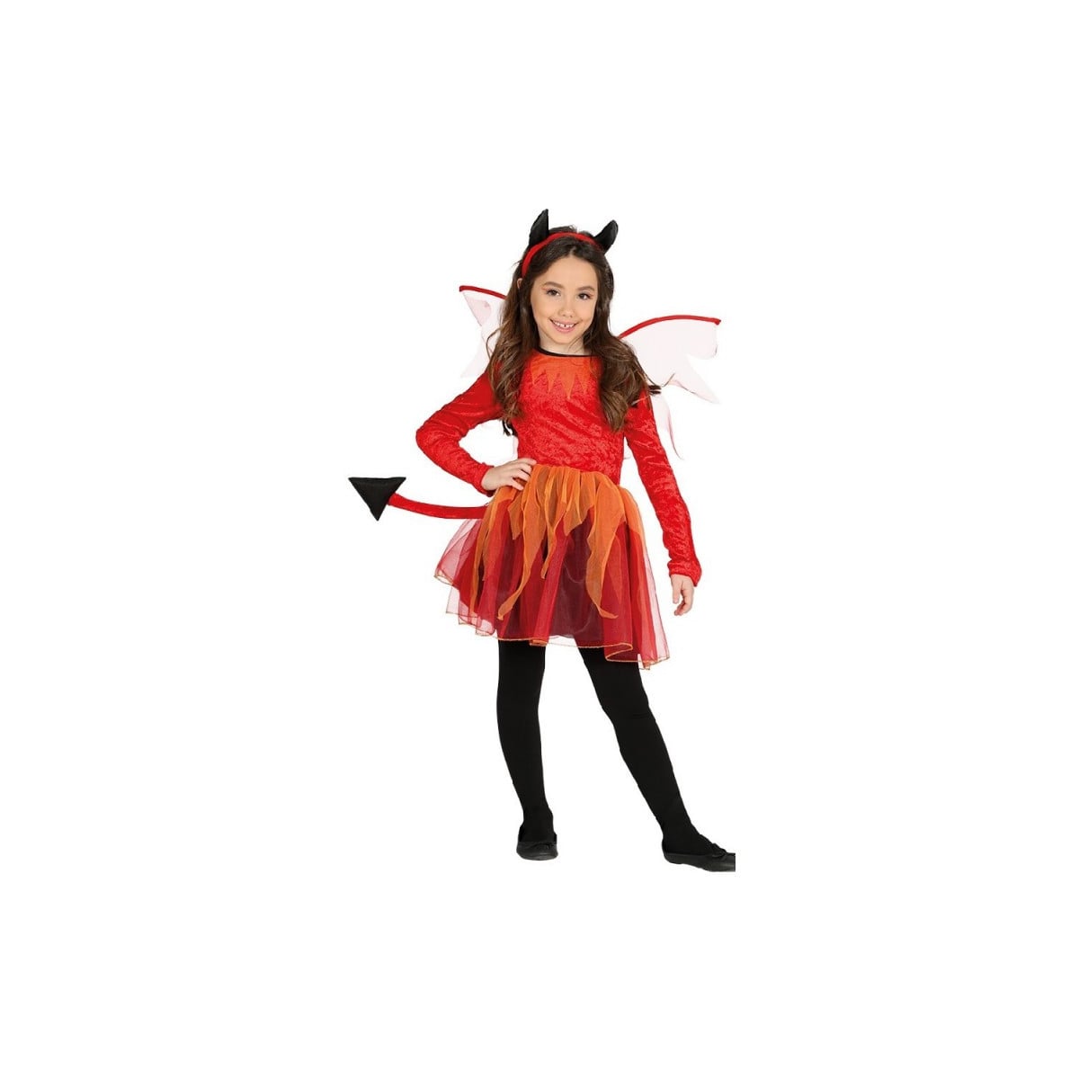 Incluye: 1 disfraz de diablesa infantil con vestido de tul rojo, diadema con cuernos, alas y cola