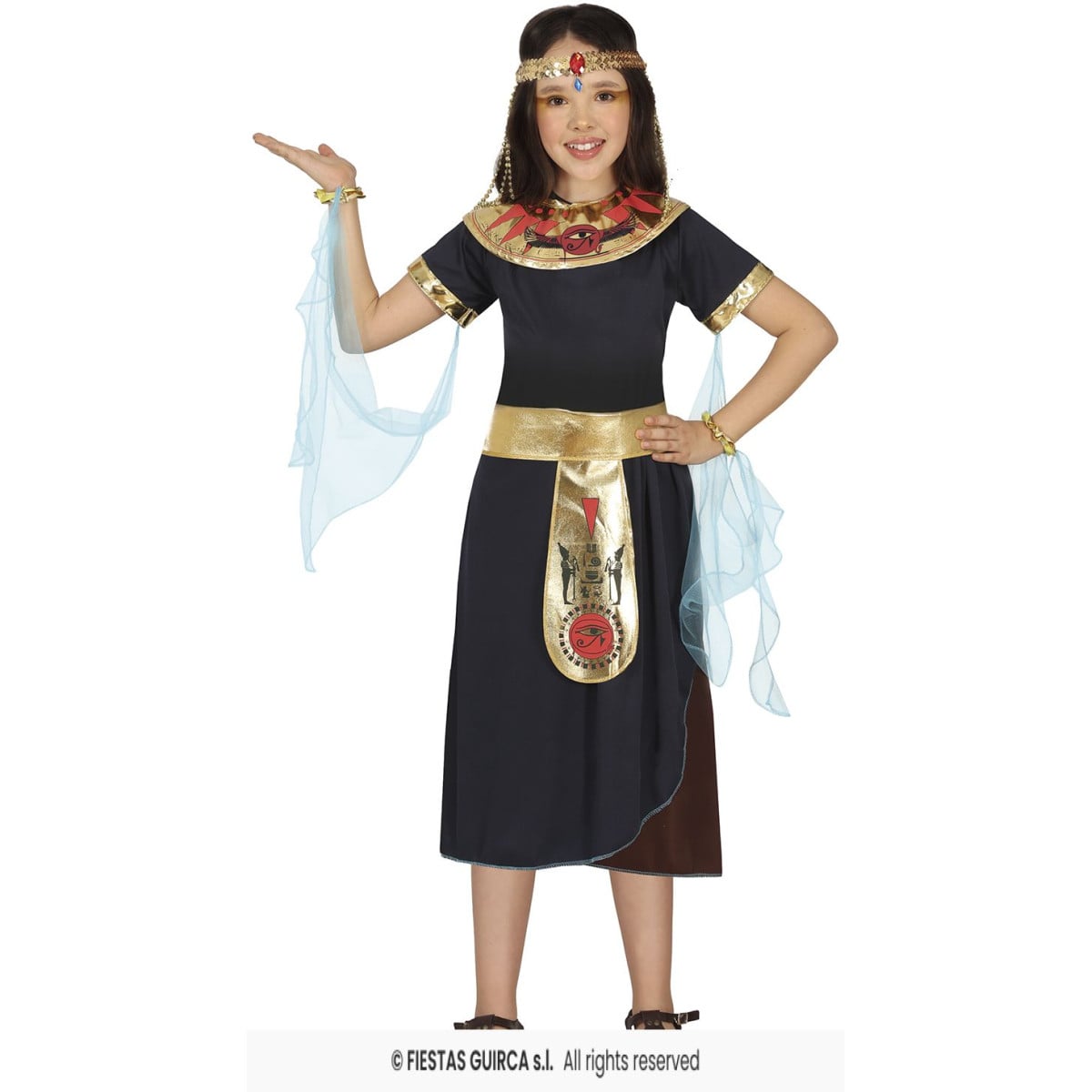 El vestido está confeccionado con un tejido suave y cómodo, permitiendo que los niños se muevan libremente mientras disfrutan de su aventura egipcia. El chal añade un toque de elegancia y sofisticación, mientras que el cinturón y el cuello dorados completan el look real. Cada detalle del disfraz está cuidadosamente diseñado para ofrecer una experiencia auténtica y memorable, pero podrás adaptarlo a tu gusto añadiendo elementos como maquillaje o un cetro.