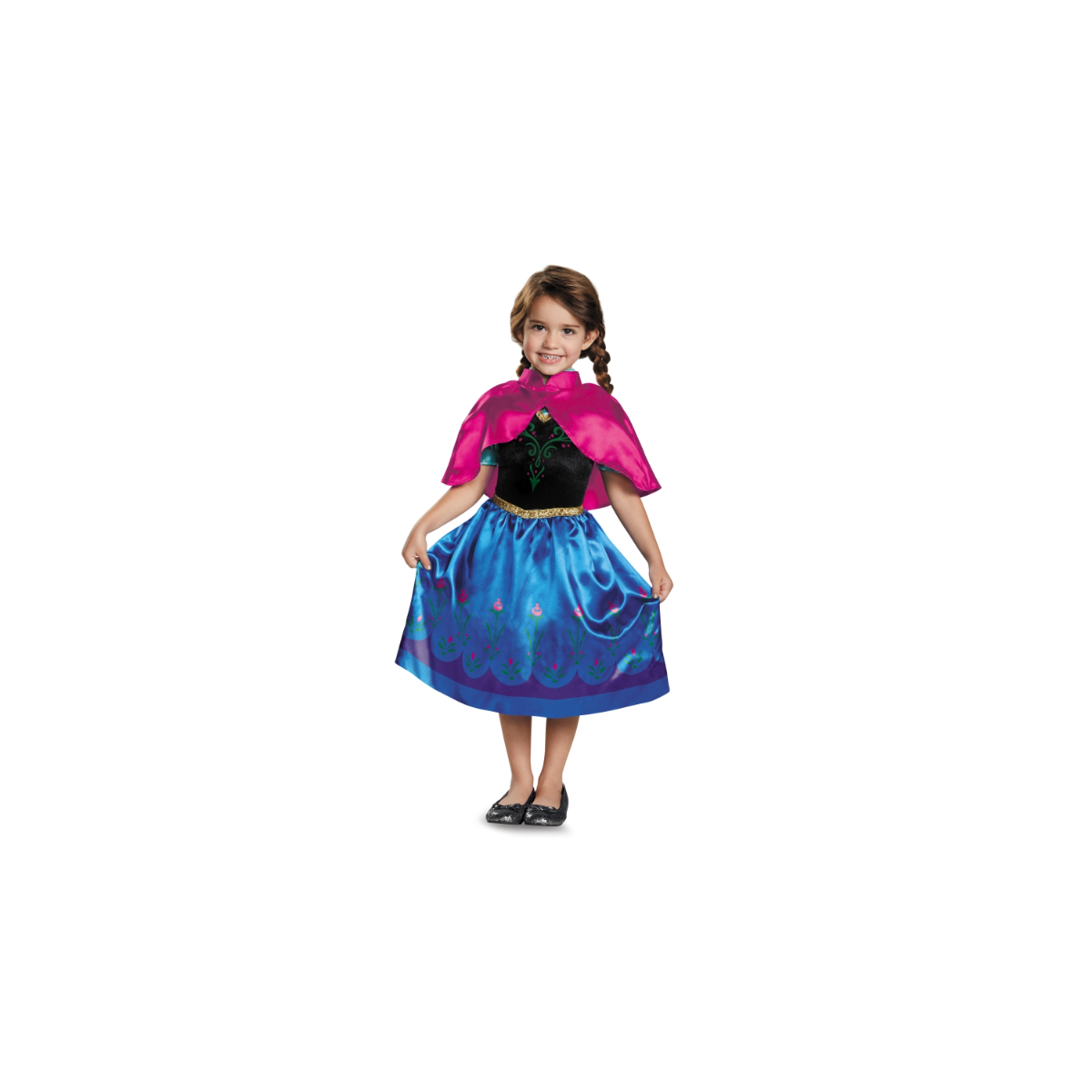 Conviértete en la intrépida Anna del reino de hielo con este Disfraz Frozen Anna Talla 3-4 Años. El vestido recrea los tonos morados y azules del atuendo icónico de Anna en su aventura hacia la montaña encantada. Cuenta con mangas largas estampadas, corpiño con detalle bordado al estilo nórdico y una falda amplia con sobrefalda estampada, delicada y suave al tacto. Incluye también capa ligera con cierre mágico que añade realismo al look aventurero.