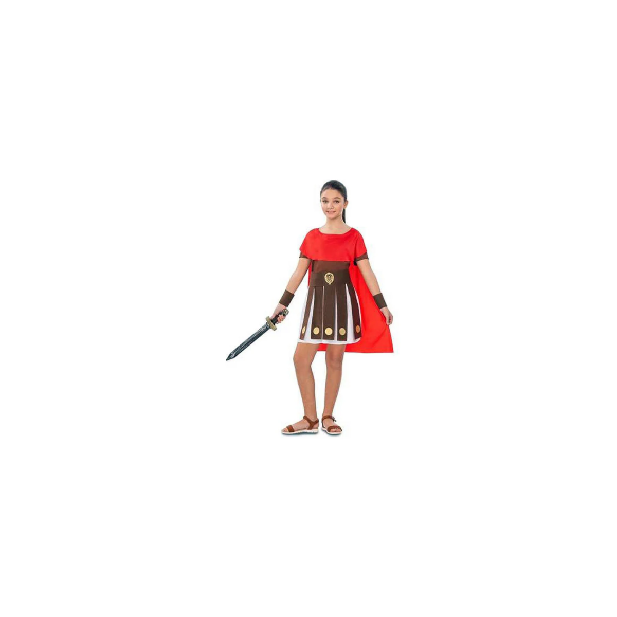 Disfraz de guerrera romana para niños y niñas con túnica marrón decorada, detalles dorados y capa roja. Ideal para Carnaval, fiestas escolares y juegos llenos de historia, aventura e imaginación.