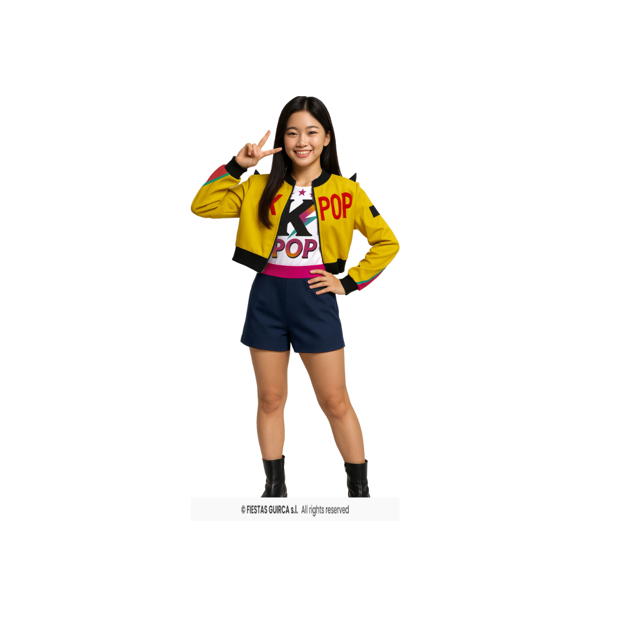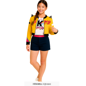 En esta versión talla 14-16 años, el disfraz es de la marca Guirca e incluye chaqueta, falda y camiseta, formando un conjunto completo con un estilo claramente inspirado en el pop coreano. La talla está orientada a esta etapa, ofreciendo un ajuste adecuado para disfrutar del disfraz con comodidad en fiestas, eventos o celebraciones. El diseño permite moverse con libertad y sentirse parte del show.