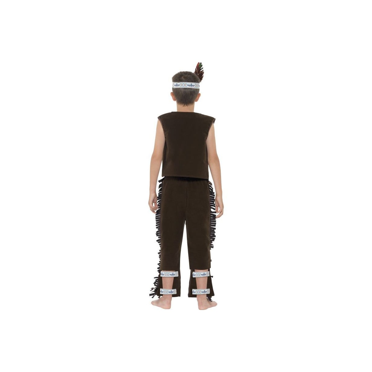 Disfraz infantil de indio en color marrón con chaleco, pantalón con flecos y cinta con pluma. Cómodo y completo, ideal para Carnaval, fiestas escolares y celebraciones temáticas para niños y niñas.