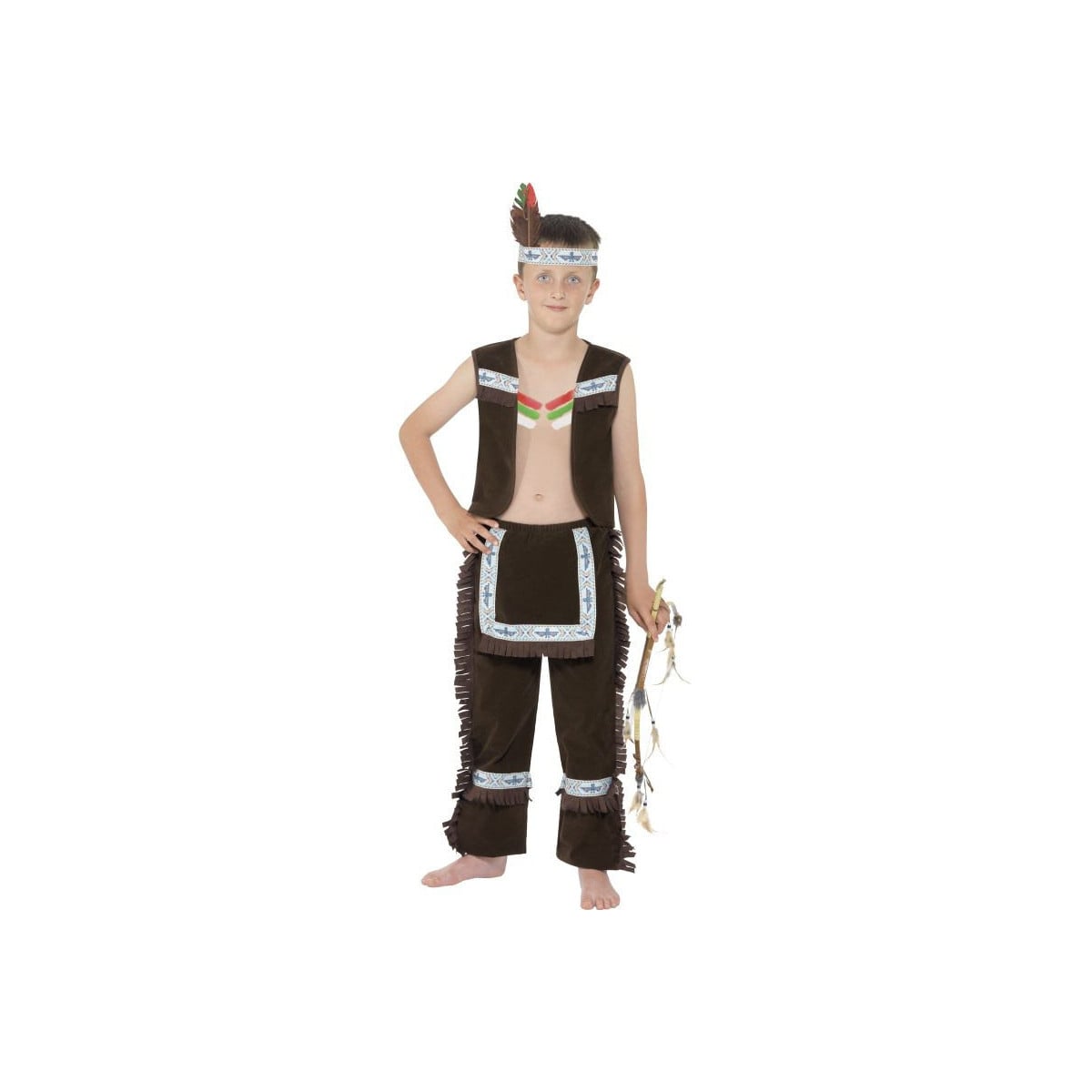 Este disfraz es perfecto para que los peques se metan en la piel de un auténtico guerrero de las praderas y vivan mil aventuras imaginarias. Conjunto en tono marrón con detalles decorativos en cenefas y flecos que le dan un acabado muy vistoso y completo.