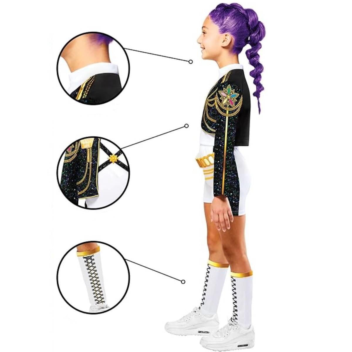 Este disfraz para niños y niñas de 7-8 años es una declaración de estilo K-Pop Demon Hunters. El conjunto incluye camiseta con chaqueta integrada y decorada con lentejuelas doradas, pantalón con cinturón en 3D y cadena impresa que aporta ese toque de estrella. Se completa con calentadores blancos y dorados que simulan el look escénico oficial de Rumi, líder de las Huntrix, cazadoras de demonios. Ideal para fiestas temáticas, shows escolares o Carnaval.