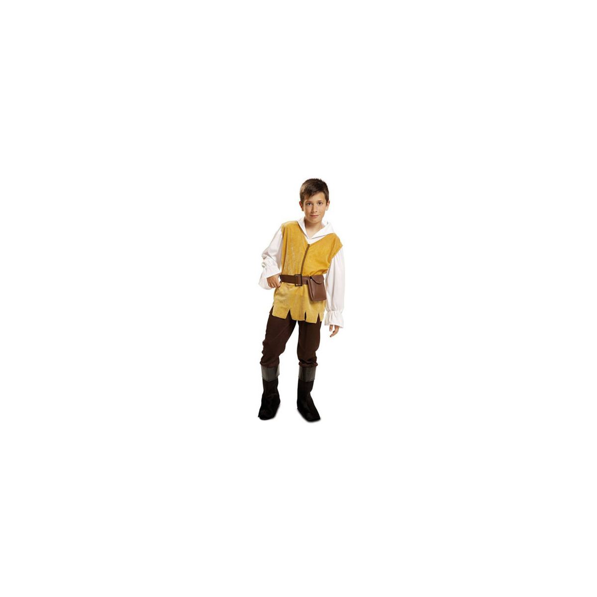 Disfraz de mesonero medieval para niños y niñas con camisa blanca, chaleco mostaza, pantalón marrón y cinturón con bolsa. Ideal para Carnaval y fiestas temáticas escolares.