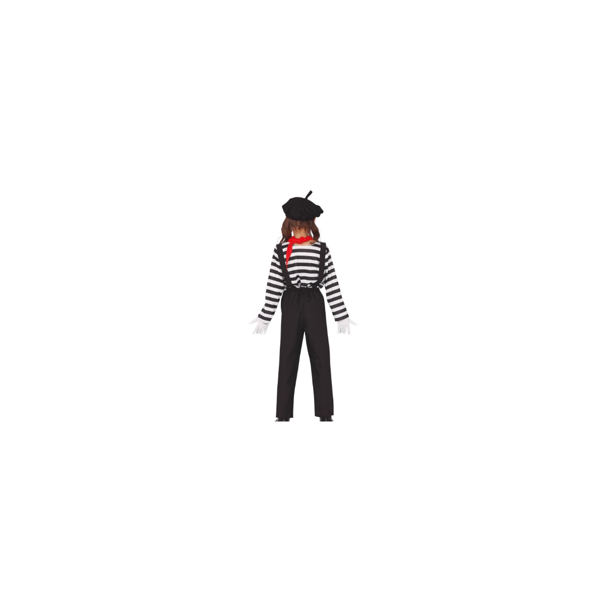 Disfraz de Mimo para niña o niño. Incluye camiseta de rayas, pantalón con tirantes, boina y pañuelo rojo. Ideal para destacar en Carnaval o Halloween.