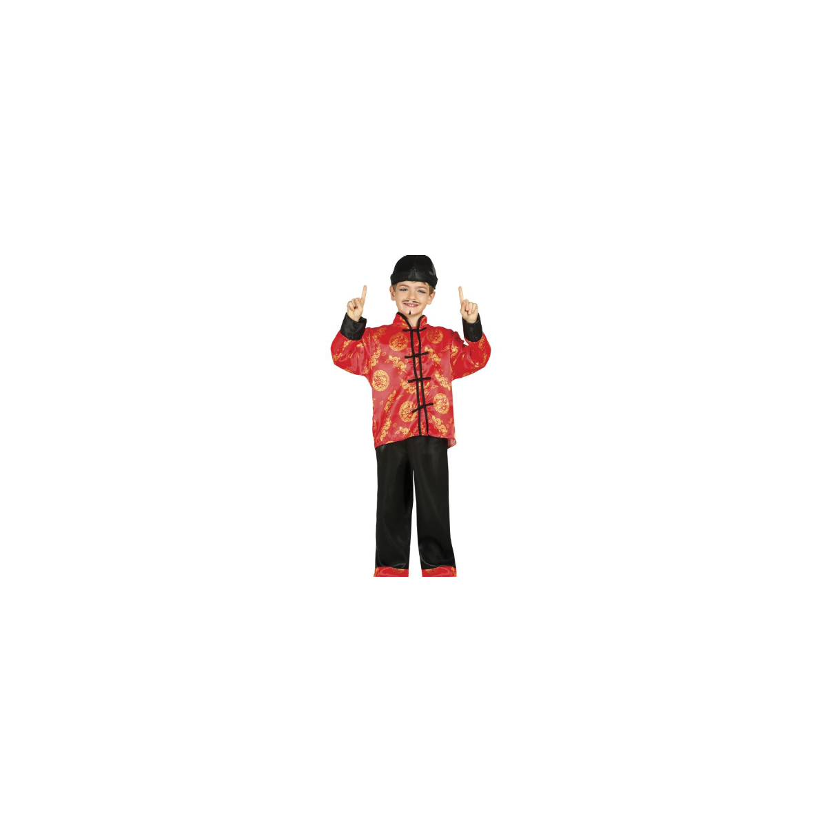 Disfraz oriental infantil talla 5-6 años con chaqueta roja, pantalón negro y gorro típico. Ideal para Carnaval o eventos culturales. Comodidad garantizada.