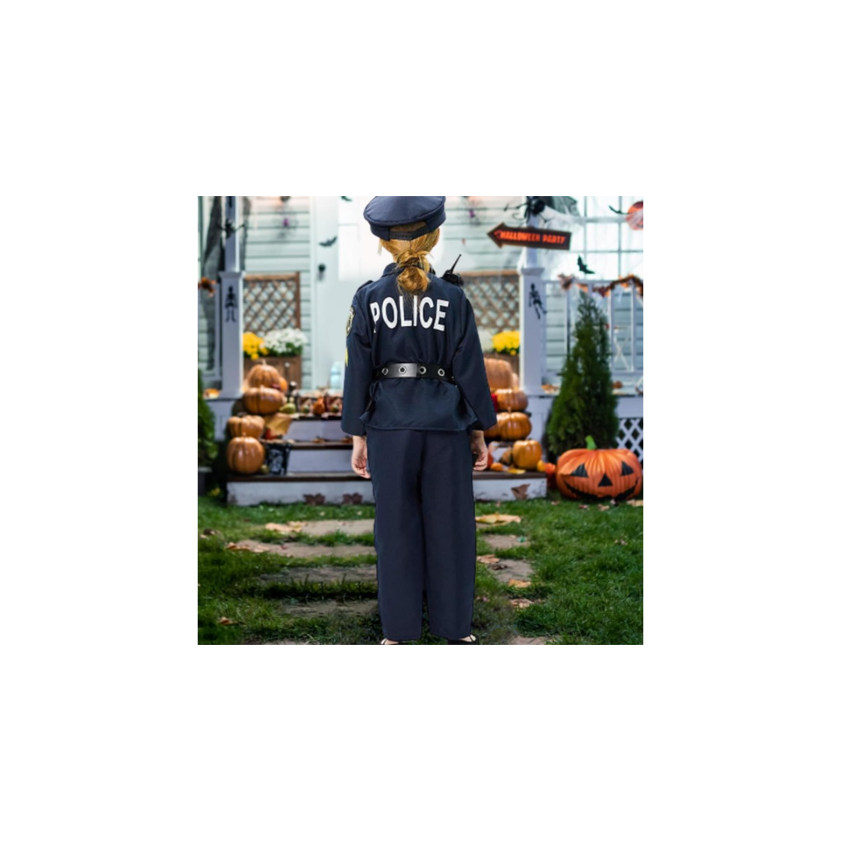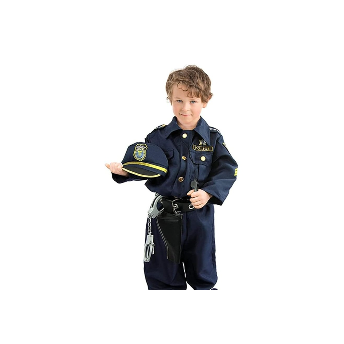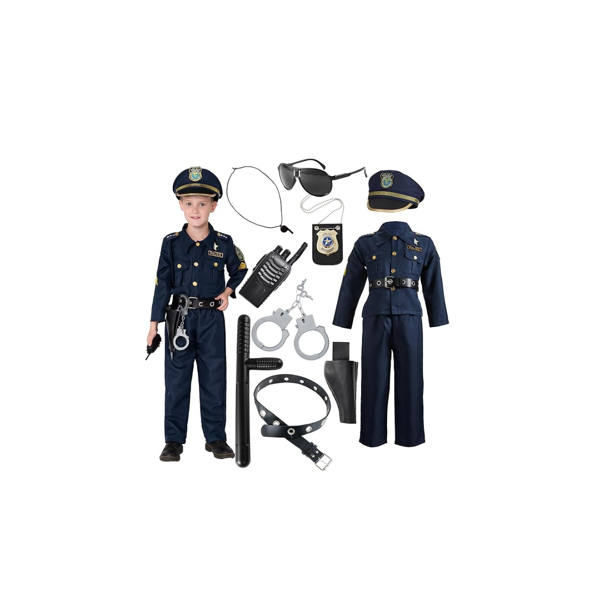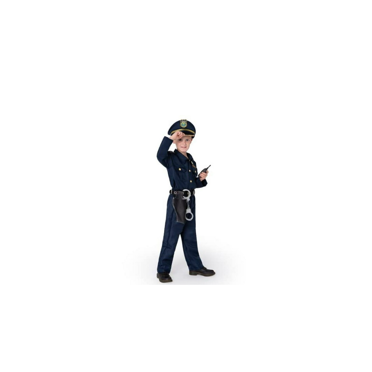 - Incluye: Chaqueta, pantalón, cinturón, placa, esposas, gorra, silbato, walkie talkie, porra, gafas y funda.