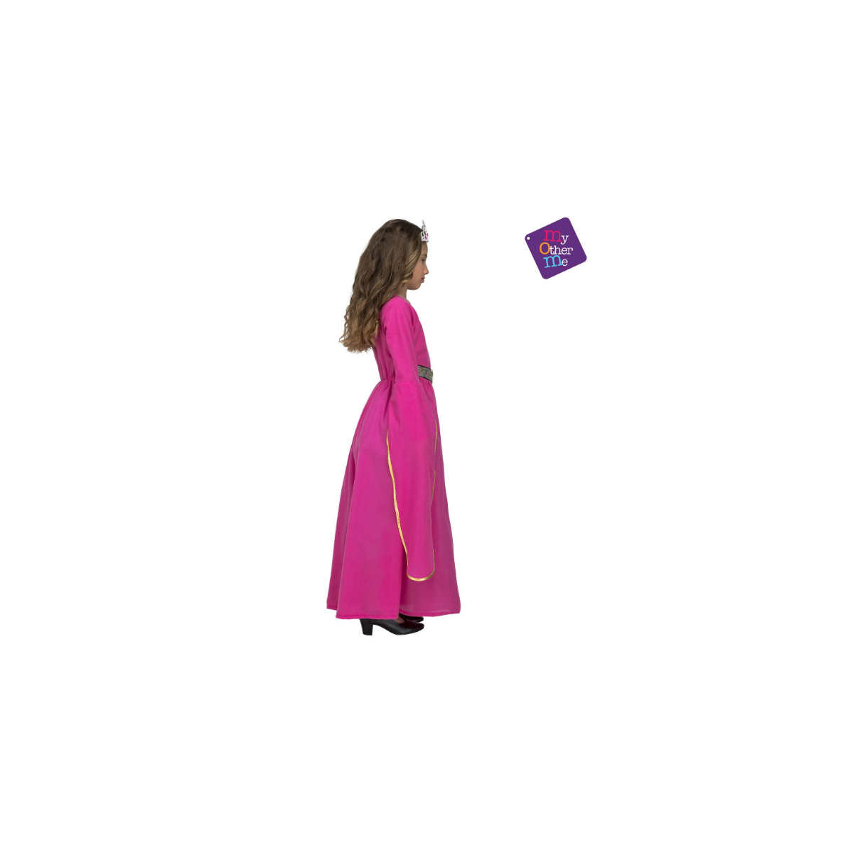 Disfraz de princesa medieval rosa para niña con vestido largo, mangas amplias ribeteadas en dorado, cinturón decorativo y tiara incluida. Elegante, cómodo y perfecto para Carnaval y fiestas temáticas.