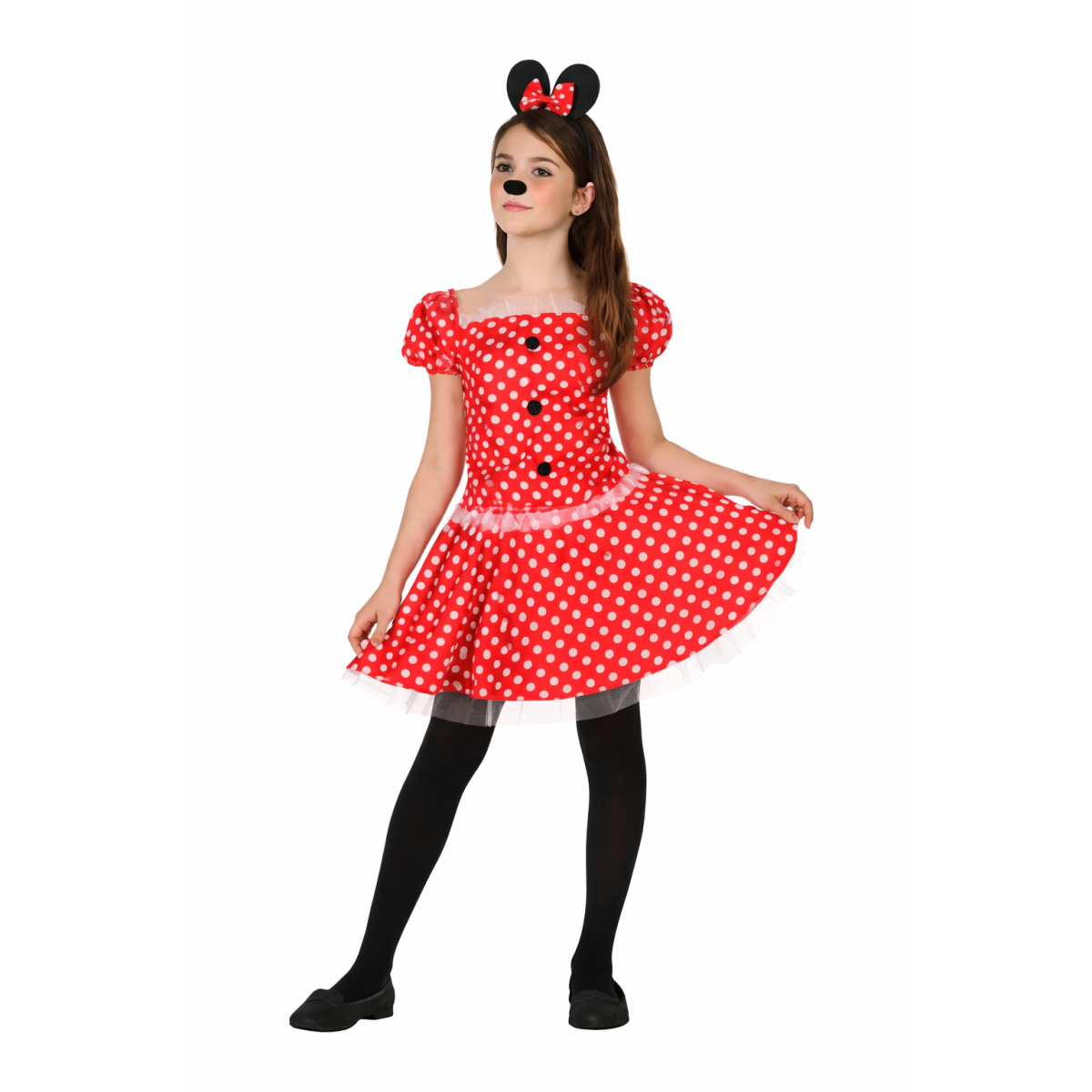 Inspirado en el universo Disney, este Disfraz Ratoncita De Lunares infantil captura la esencia de Minnie Mouse, con su estilo coqueto, optimista y siempre alegre. Es un disfraz que transmite diversión desde el primer vistazo y conecta directamente con los dibujos animados más clásicos.