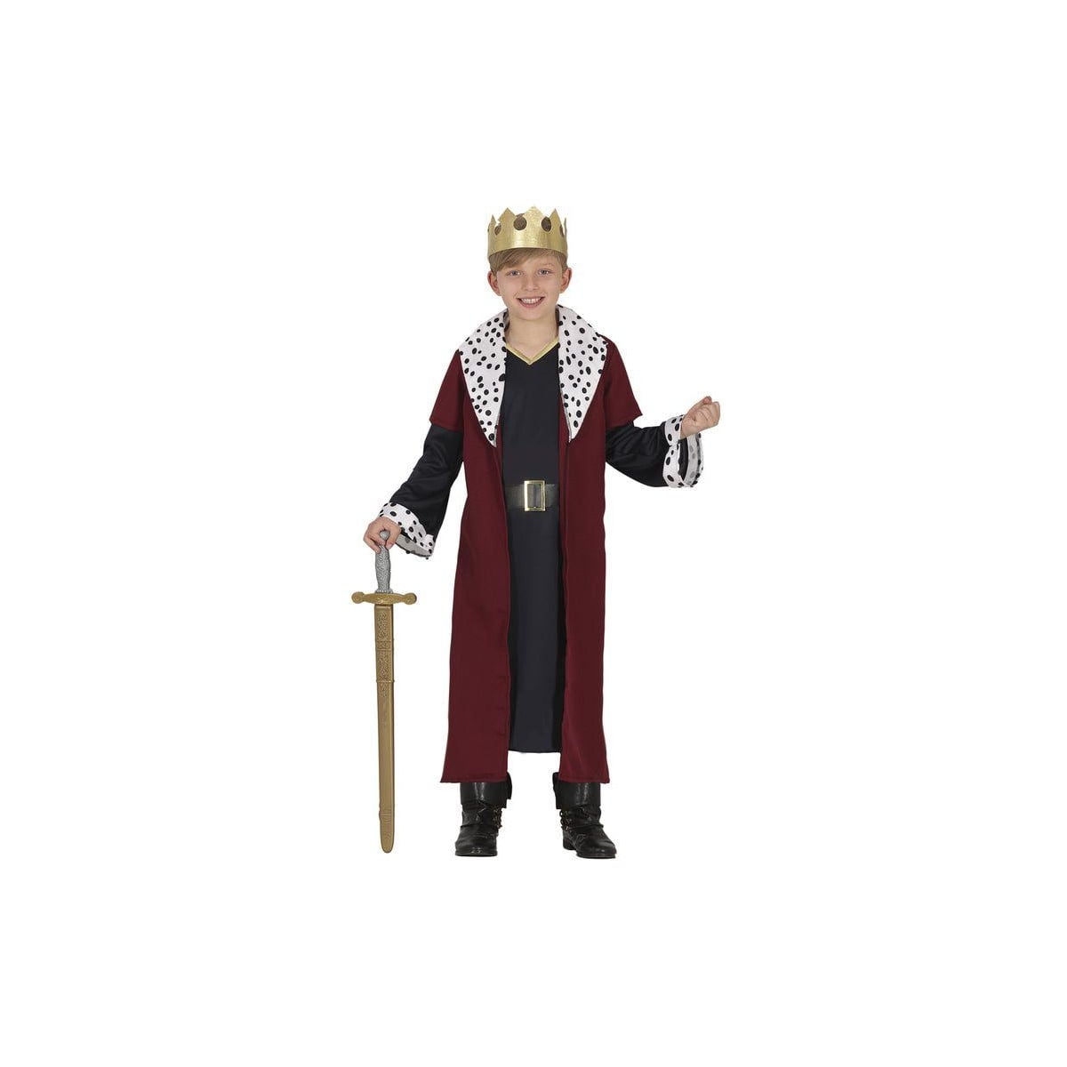 Disfraz de rey medieval para niño con túnica granate, detalles efecto armiño y corona dorada incluida. Elegante y cómodo, perfecto para Carnaval, fiestas medievales y funciones escolares.