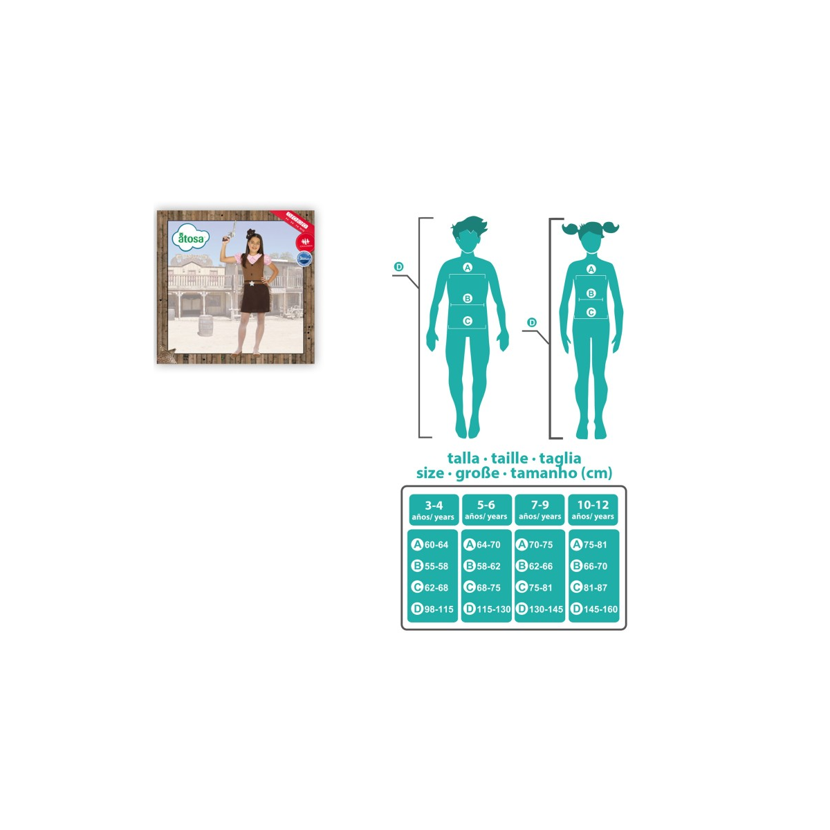 - Talla: Talla 10-12 años. Altura (145-160 cm), pecho (75-81 cm), cadera (81-87 cm) y cintura (66-70 cm).