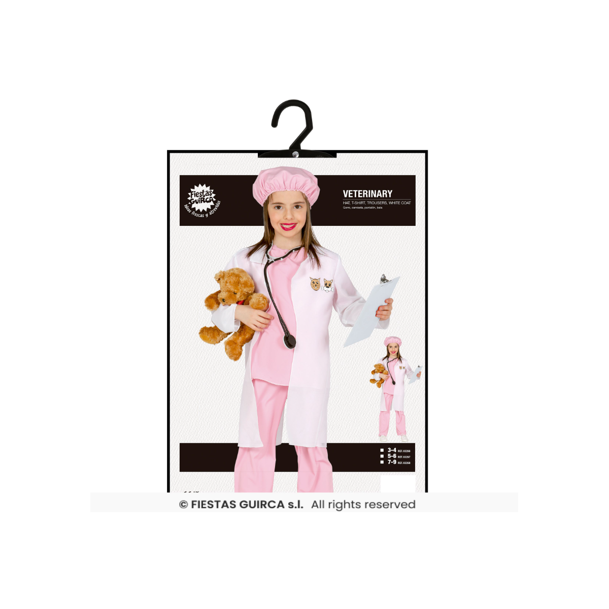 En esta talla, el conjunto está pensado para ofrecer comodidad y facilidad de uso, ideal para edades tempranas. Incluye las prendas necesarias para recrear el look de una veterinaria de forma sencilla. Guirca ha diseñado este disfraz teniendo en cuenta la movilidad y el confort, permitiendo que el peque juegue sin molestias.