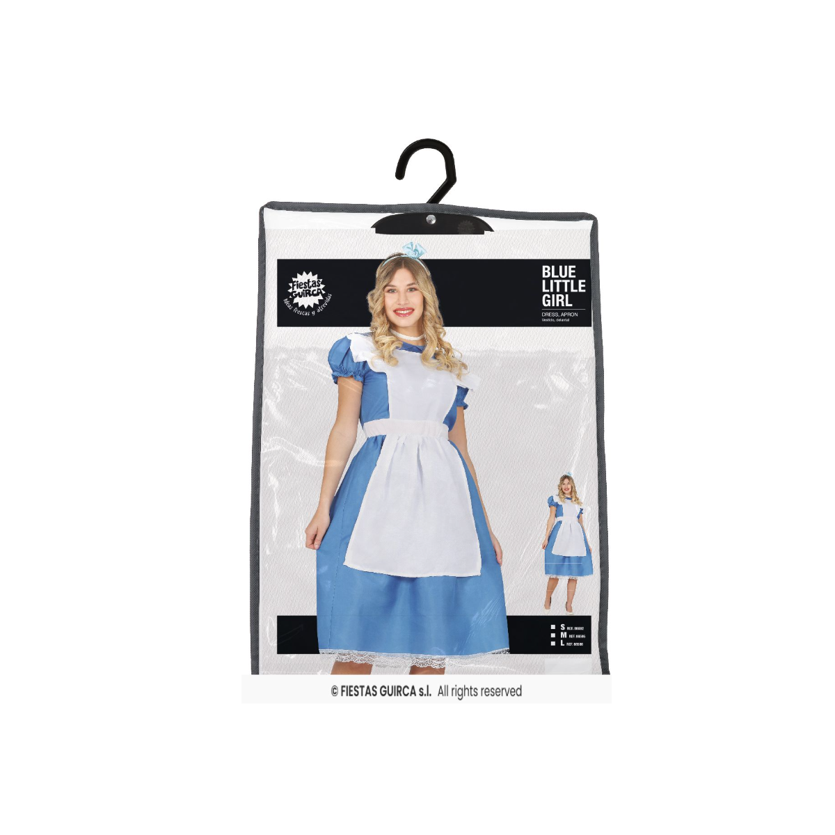 Este Disfraz Alicia Vestido Azul de Guirca, disponible en talla L, que incluye vestido y delantal, ofreciendo un conjunto completo para una caracterización fiel al personaje.