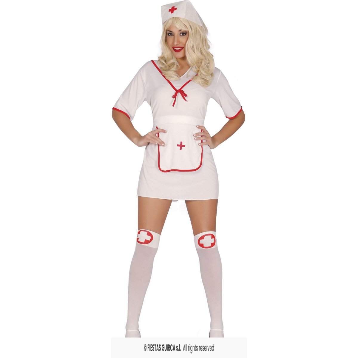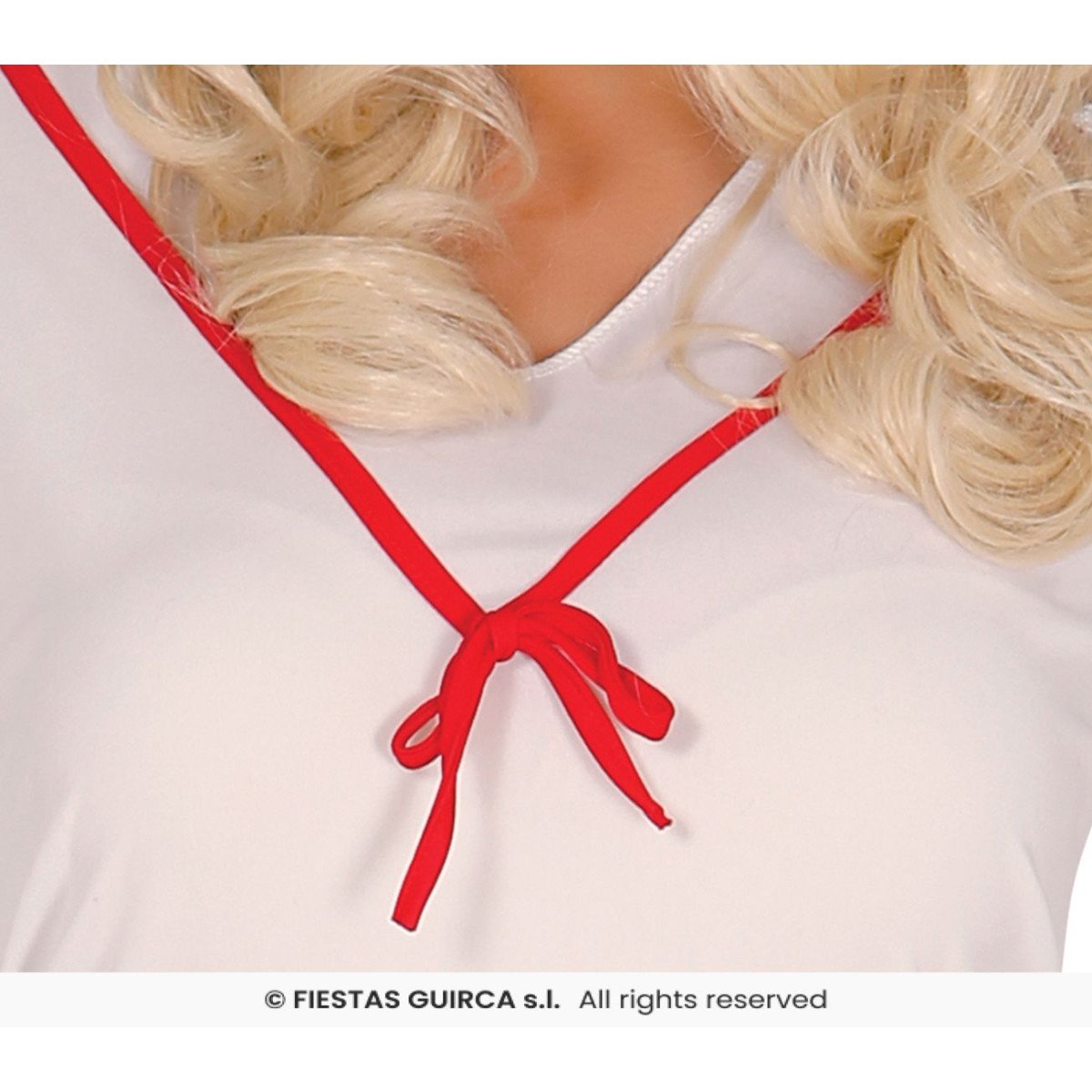 El diseño incluye un vestido blanco con ribetes rojos, un delantal con cruz sanitaria y una cofia a juego que completa el atuendo. Fabricado con materiales ligeros y transpirables, permite moverte con libertad sin perder el toque elegante y cuidado que lo caracteriza. Su estilo versátil encaja tanto en fiestas divertidas como en ambientaciones más teatrales o humorísticas.