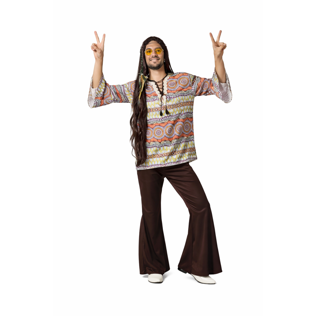 Descubre el Disfraz Hippie Rolling Vibes; con esencia setentera que transforma cualquier celebración en un auténtico festival de paz, música y libertad.