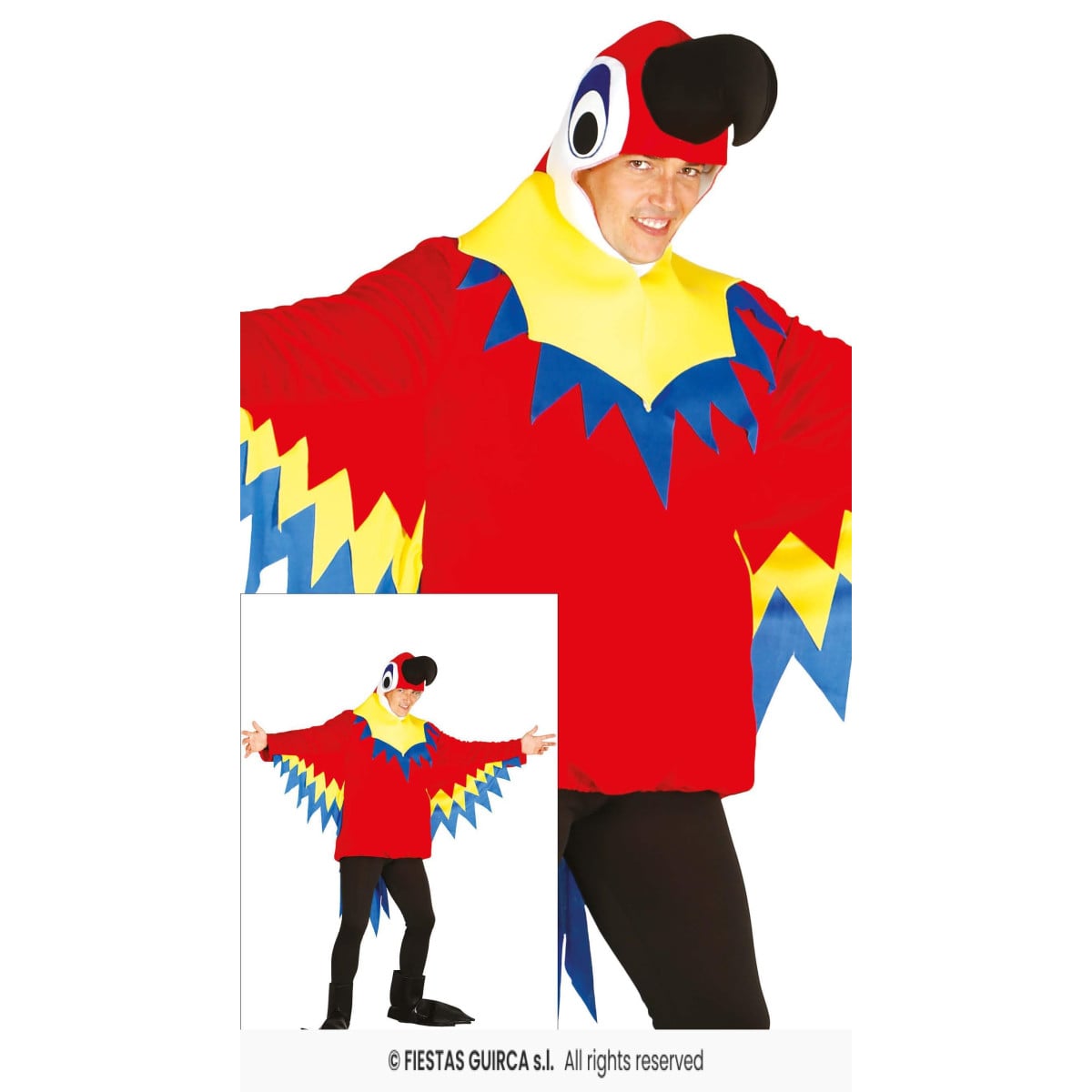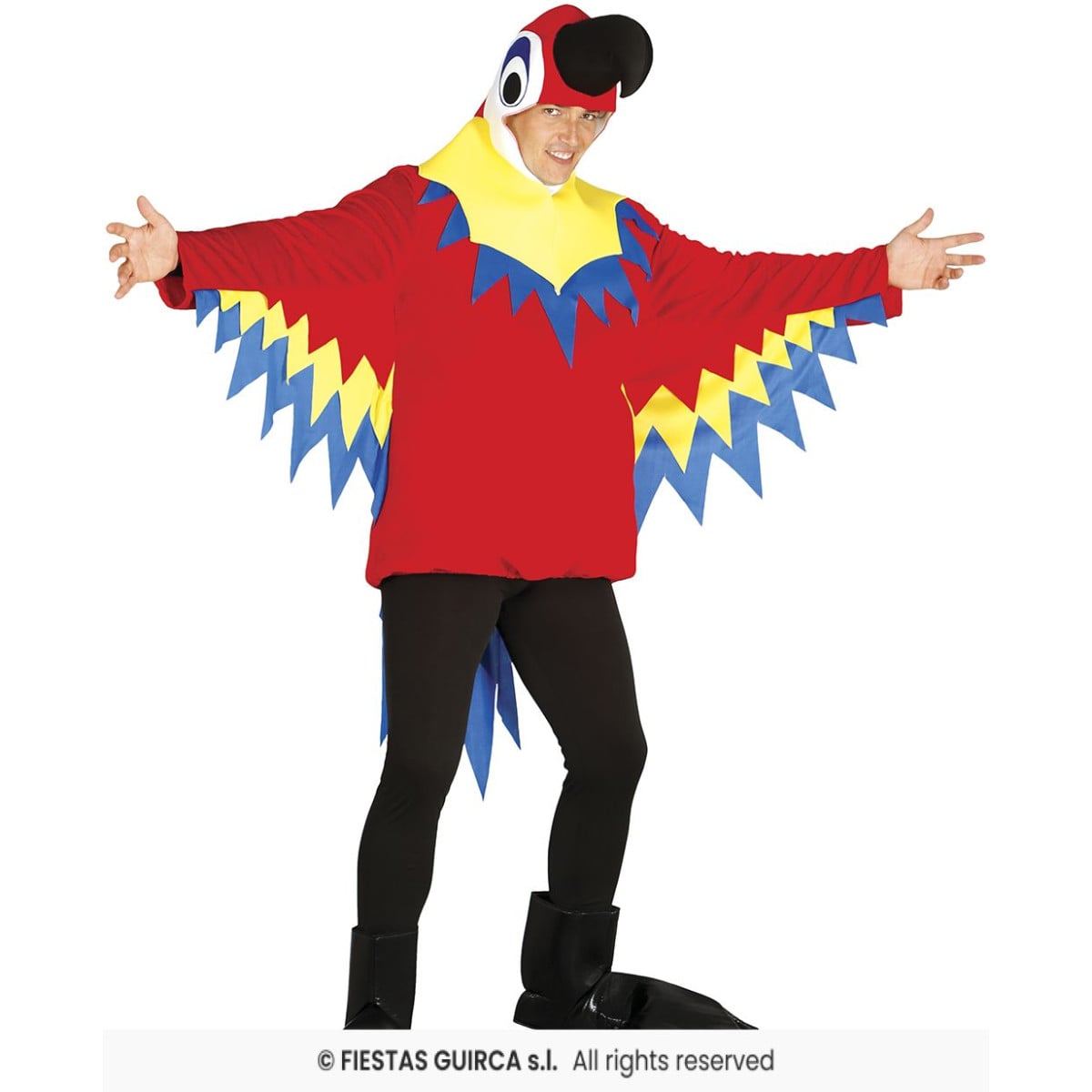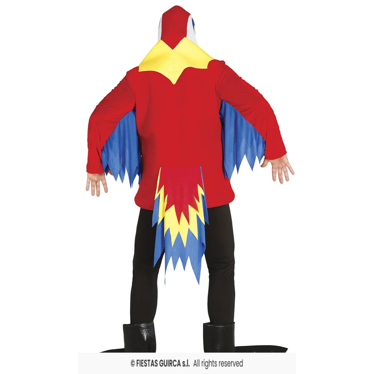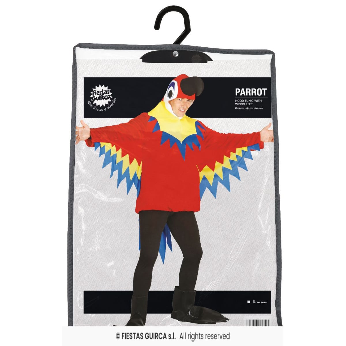 - Incluye: Alas, pies, túnica y capucha con cara de loro rojo.
