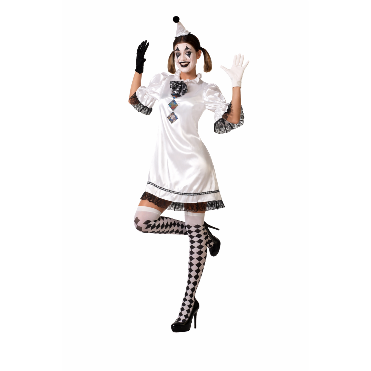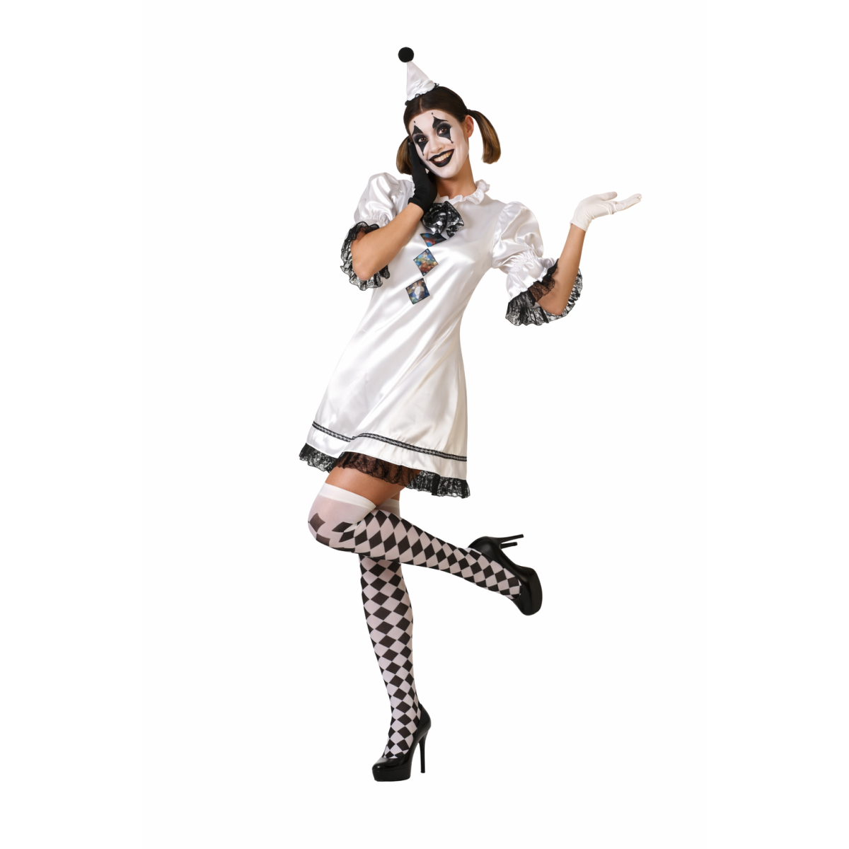 Este Disfraz Payasa Blanco Y Negro es una propuesta perfecta para quienes buscan un disfraz original, con un punto artístico y diferente a los modelos más clásicos. Una elección que combina elegancia, fantasía y diversión en un solo conjunto.