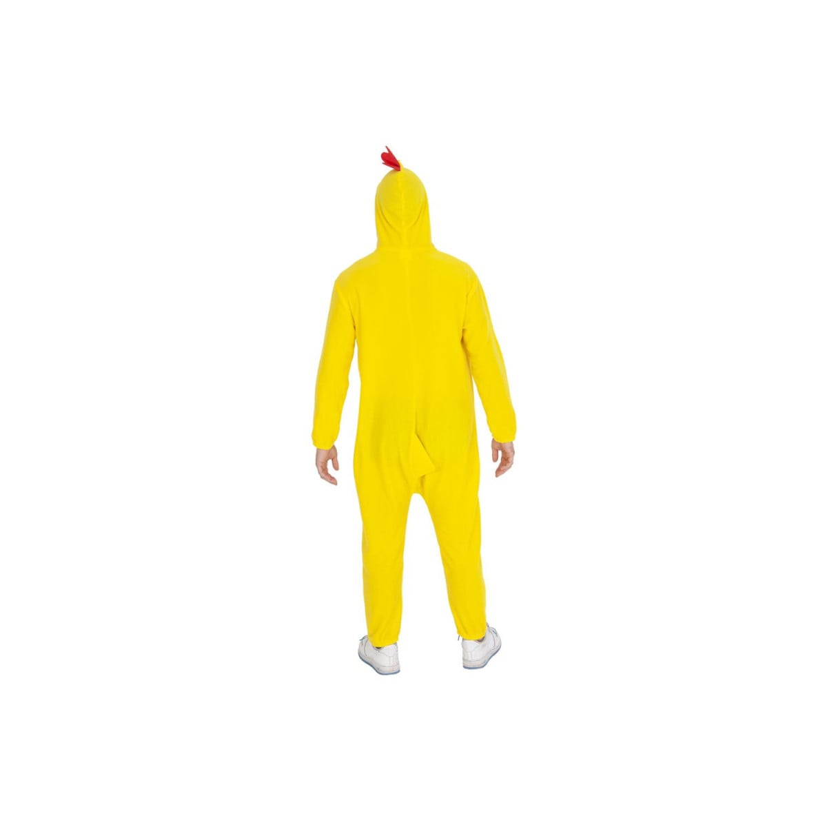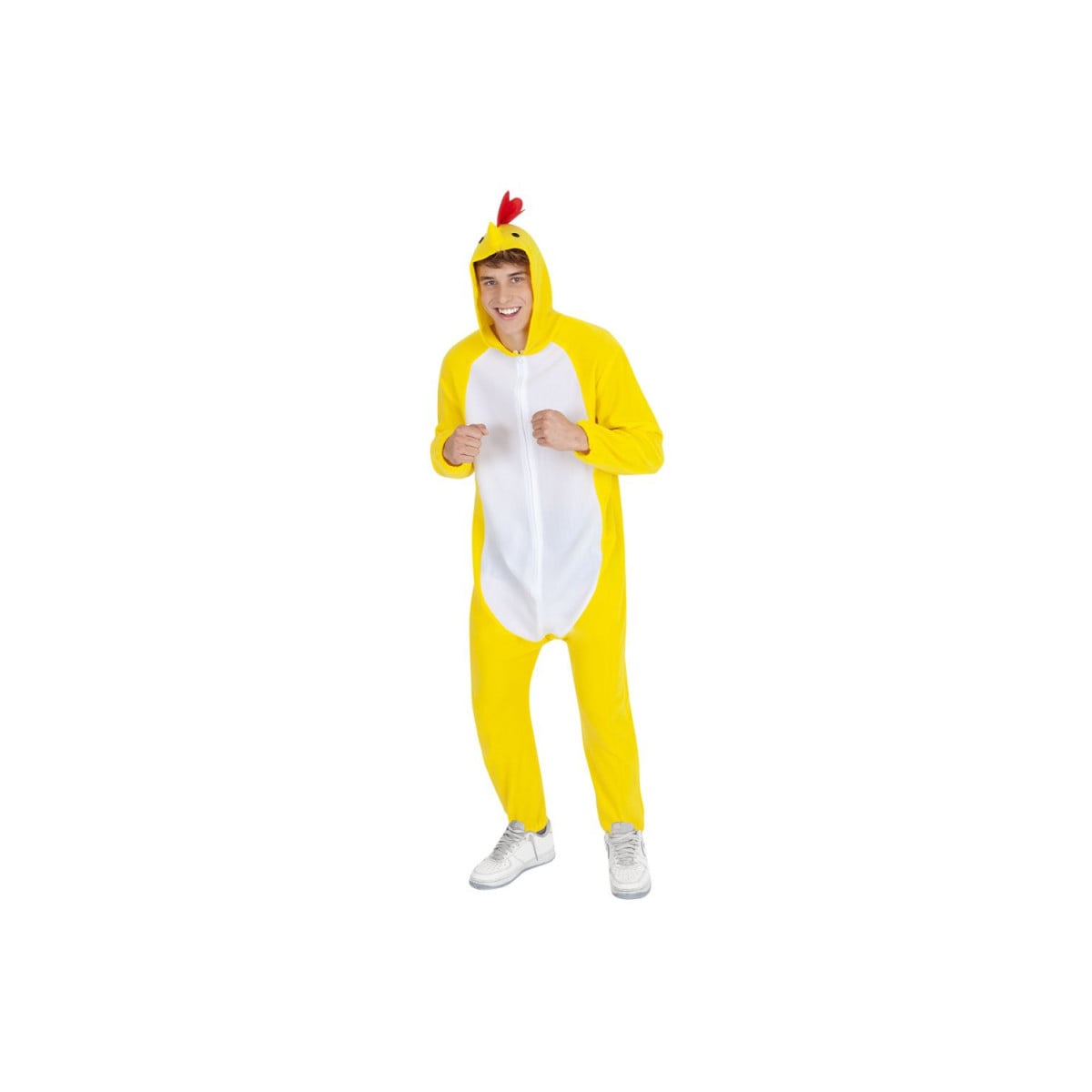 Este disfraz está compuesto por un mono amarillo con capucha en forma de cabeza de pollo, con detalles como el pico y la cresta roja, que le dan un toque auténtico y llamativo. Su diseño holgado garantiza comodidad y libertad de movimiento, para que puedas disfrutar al máximo de la fiesta sin preocupaciones.